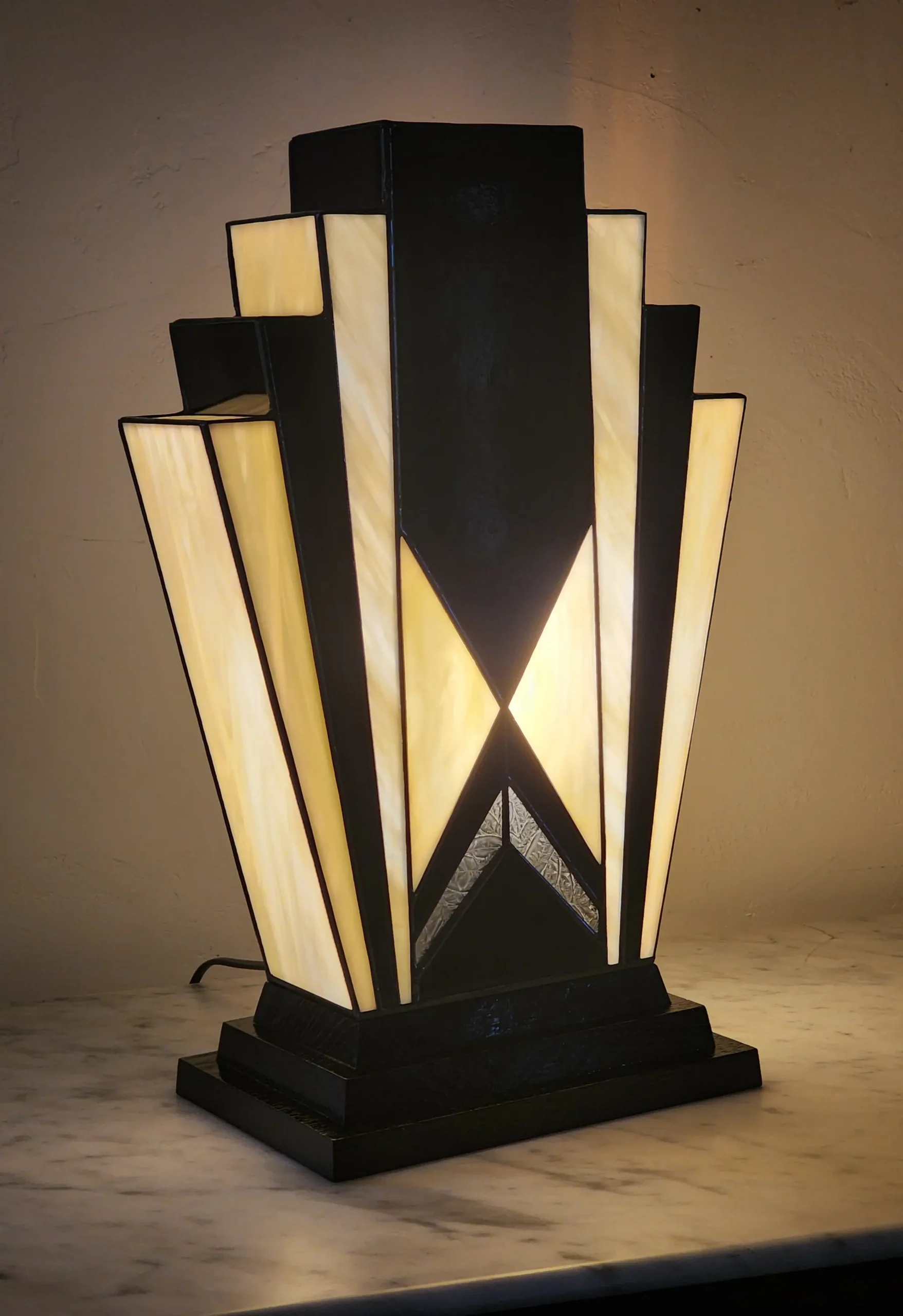 Cette lampe Art Déco en vitrail Tiffany a été créée comme un hommage aux lignes architecturales et géométriques des années 1920–1930. Les verres opalescents ivoire dialoguent avec le verre noir brillant, soulignant une composition graphique élégante et structurée. Une touche de verre “Or”, discrètement intégrée, capte la lumière et diffuse une luminosité chaleureuse, douce et enveloppante.