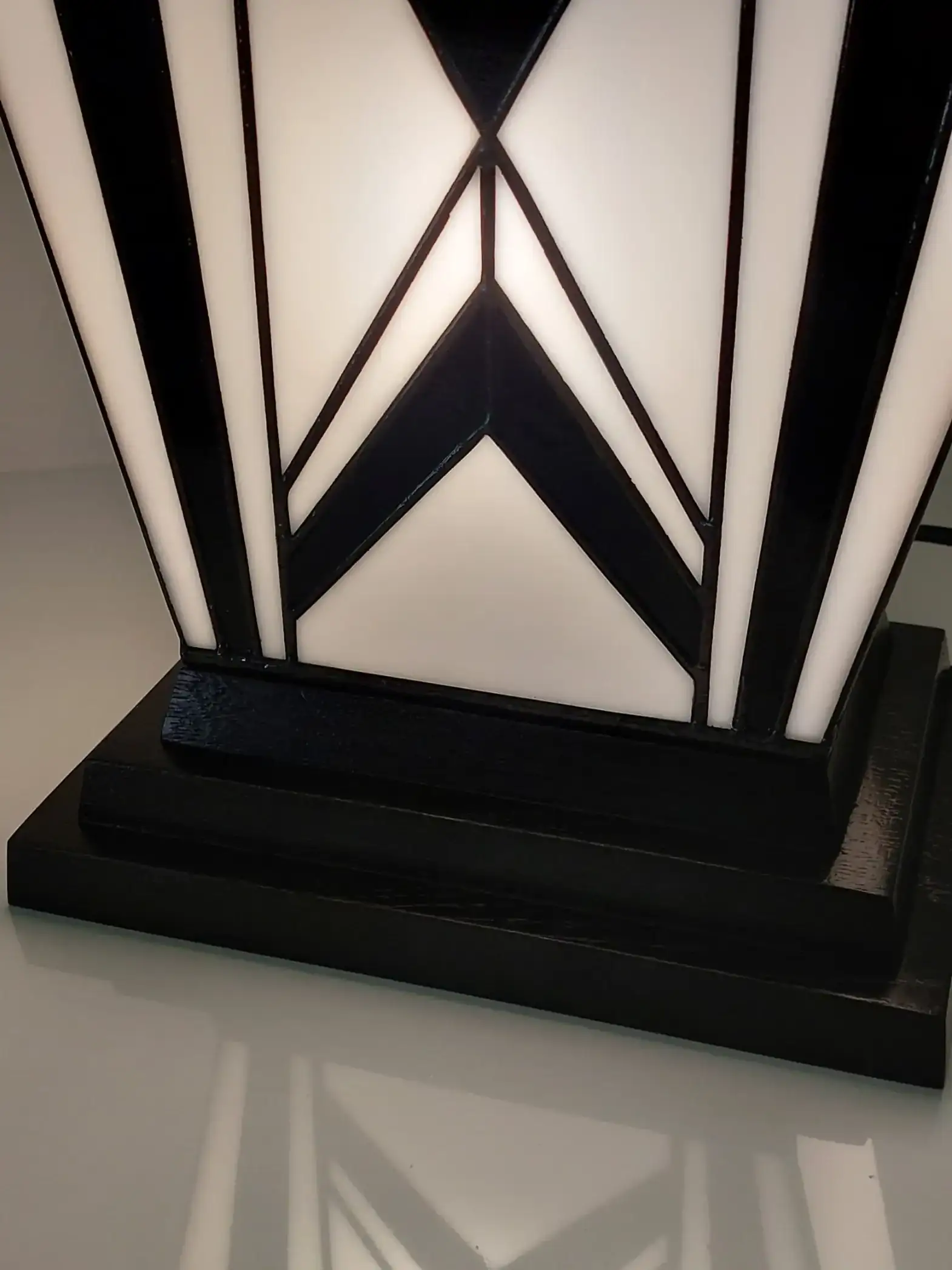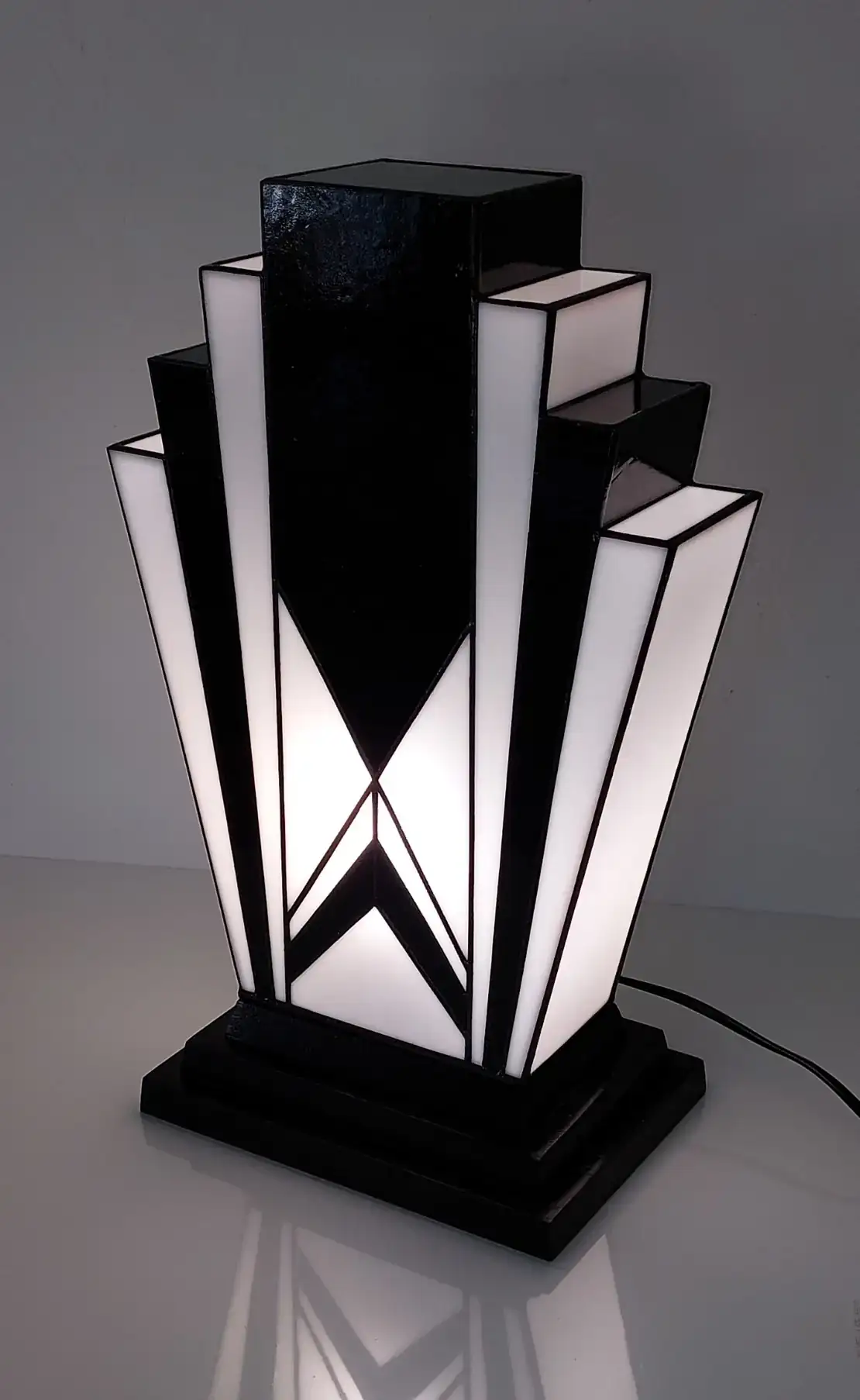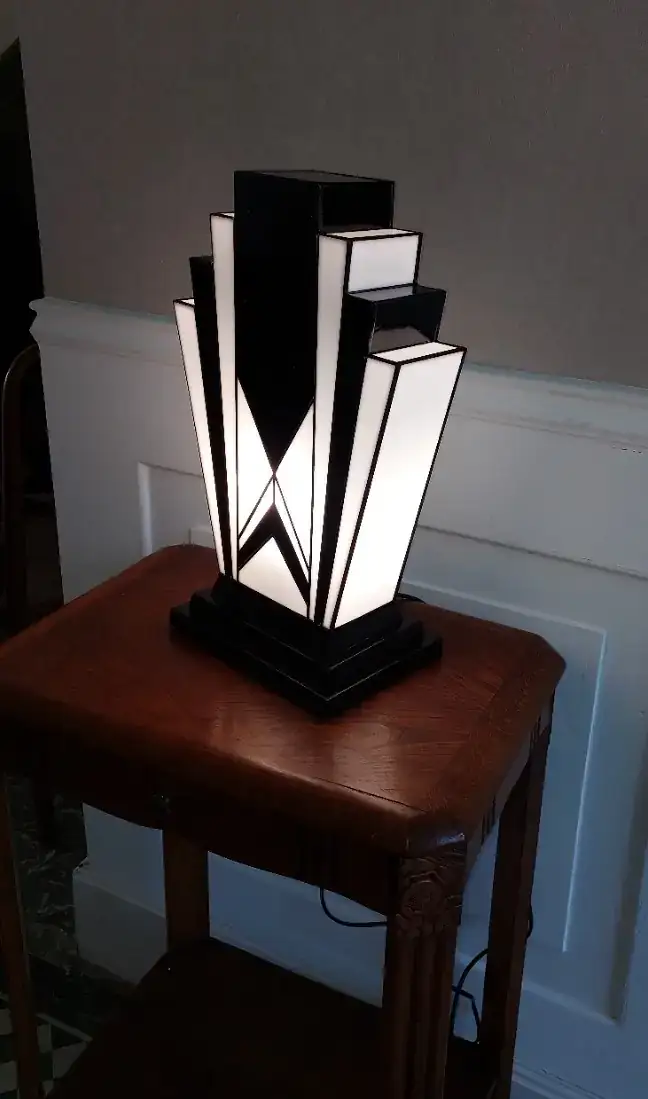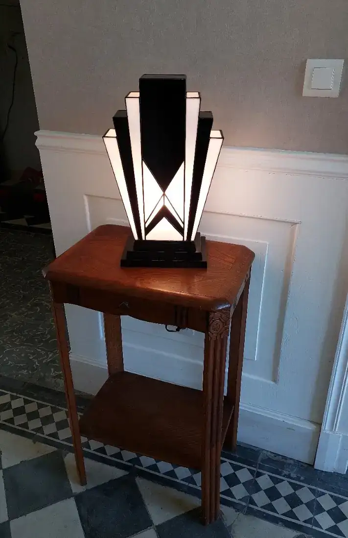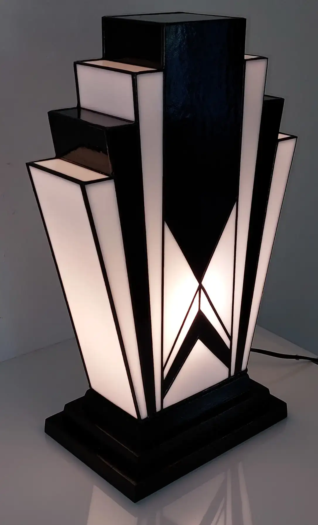 Cette lampe Art Déco en vitrail Tiffany noir et blanc séduit par ses lignes géométriques élégantes, ses verres opalescents diffusant une lumière douce et son socle en chêne massif sculpté, pour une pièce artisanale raffinée et intemporelle.