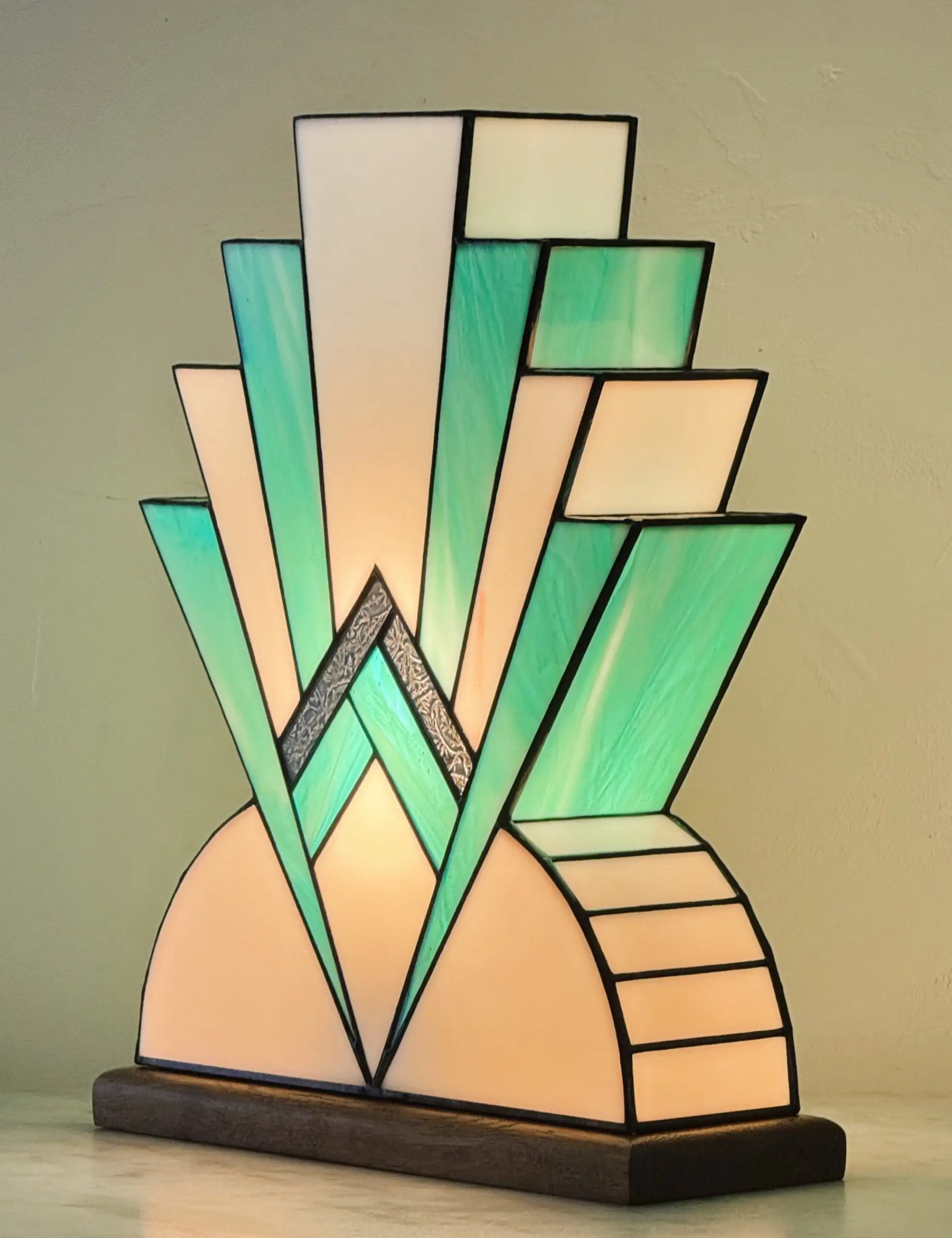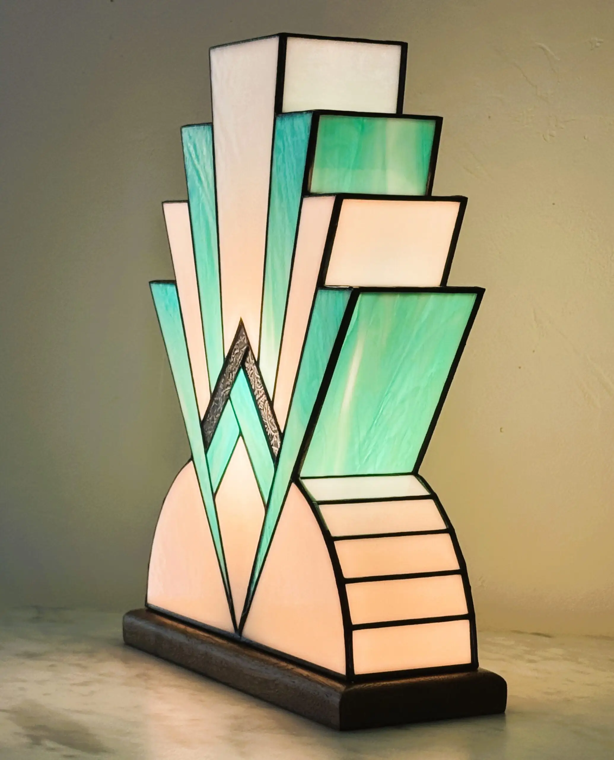 Lampe de table Art Déco réalisée à la main selon la technique traditionnelle Tiffany. Son design géométrique symétrique, inspiré des gratte-ciels des années 1920, associe des verres opalescents blanc pur et bleu canard, sublimés par un détail central en verre ancien aux reflets or et bronze. Socle chêne massif teinté chêne doré.