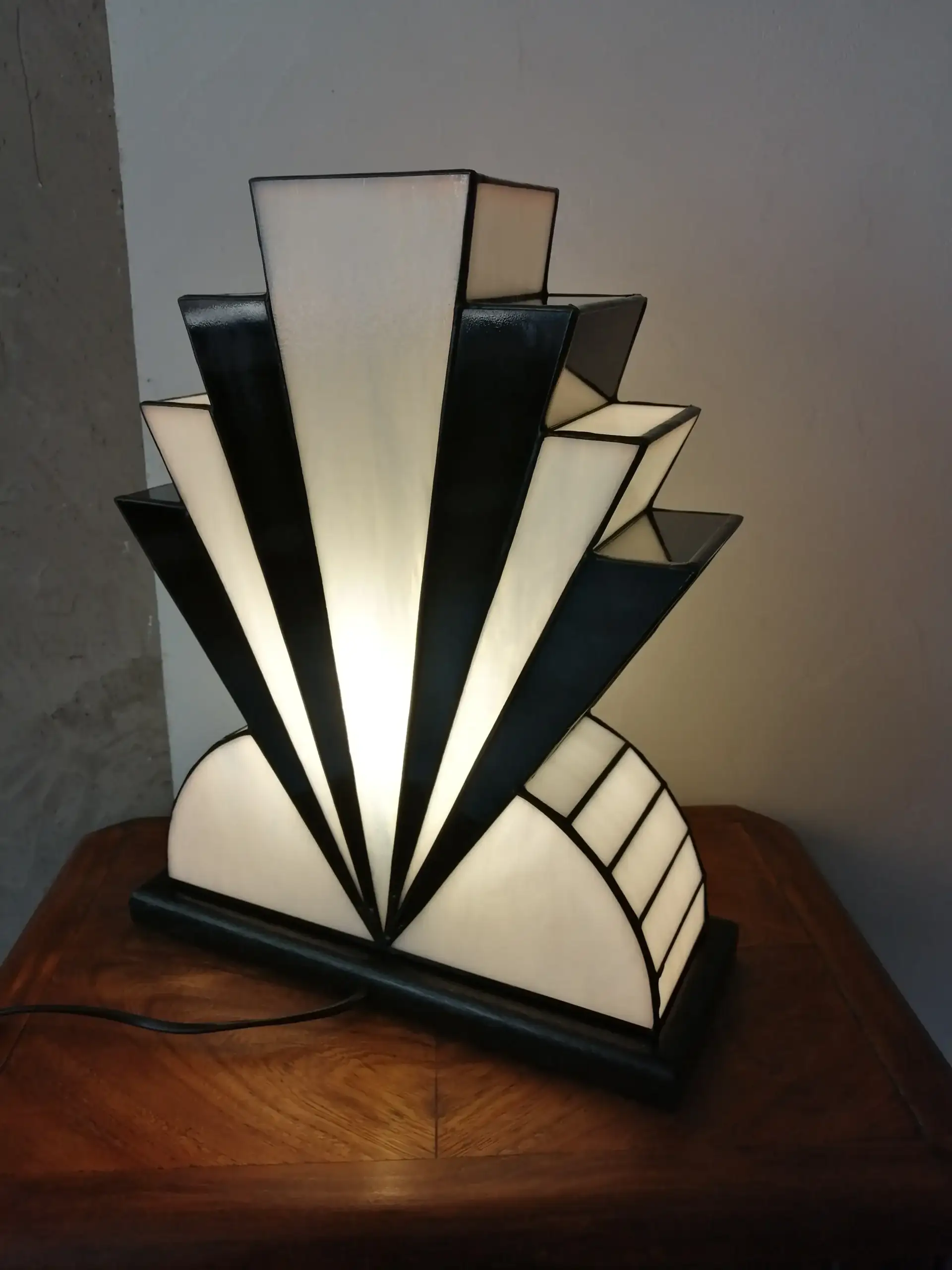 Dans mon atelier d’artiste-verrier, je façonne cette lampe Art Déco artisanale comme une pièce sculpturale et lumineuse. Les verres opalescents blanc pur diffusent une lumière douce et enveloppante, tandis que le verre noir laqué affirme la géométrie et le contraste. Une discrète touche de verre or capte la lumière et apporte une chaleur précieuse, fidèle à l’esprit des créations des années 1920.