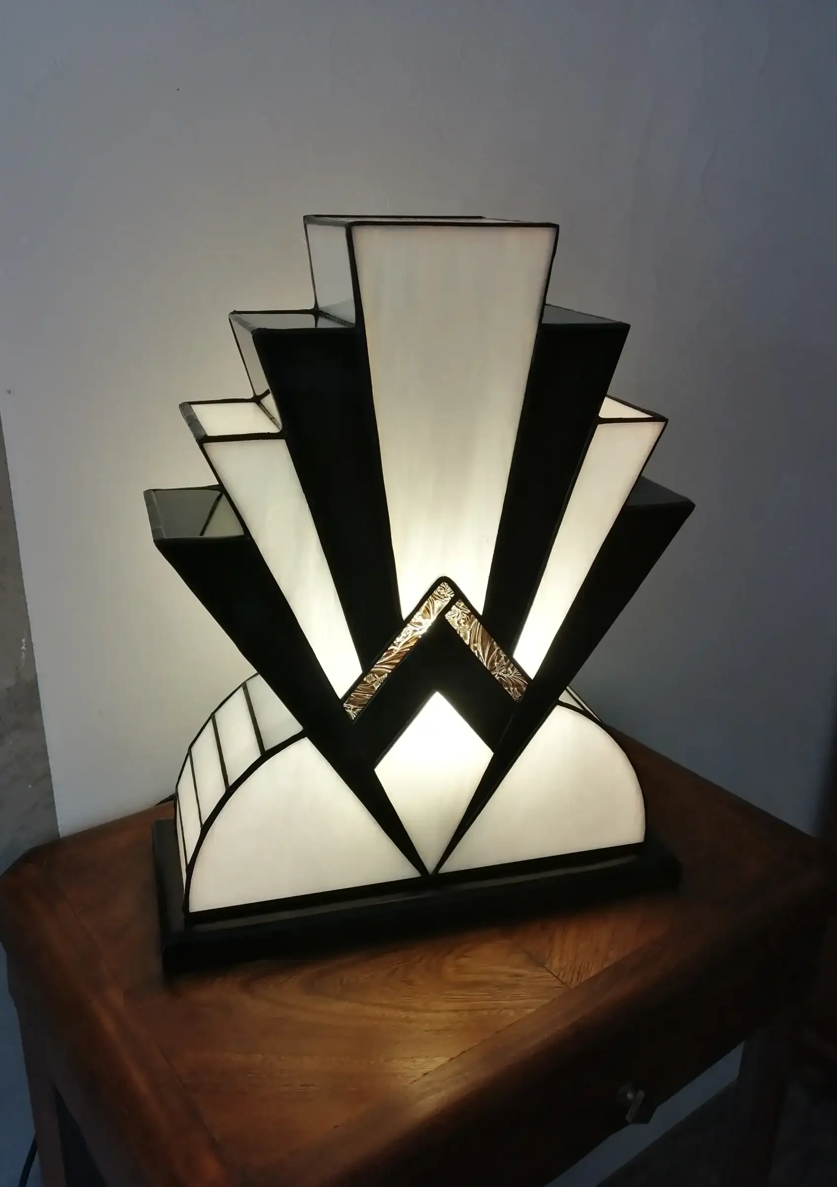 Lampe Art Déco en vitrail Tiffany opalescent blanc et noir laqué, sublimée d’une touche de verre or. Création artisanale réversible, montée sur un socle en chêne massif sculpté et teinté noir, diffusant une lumière douce et chaleureuse.