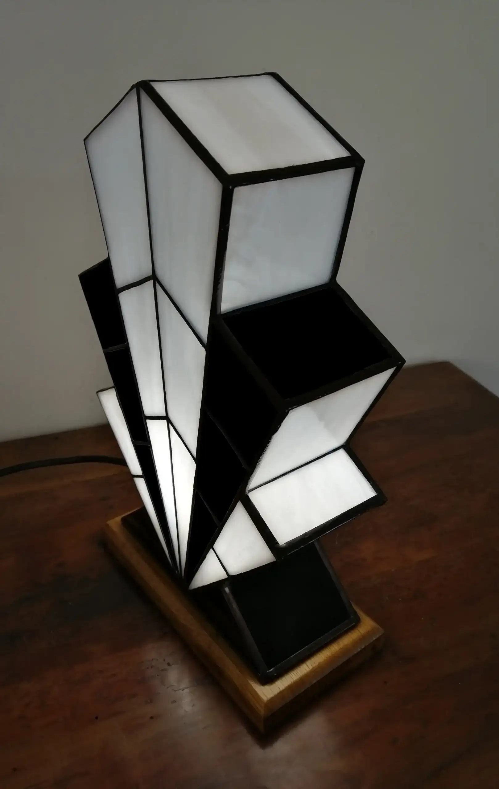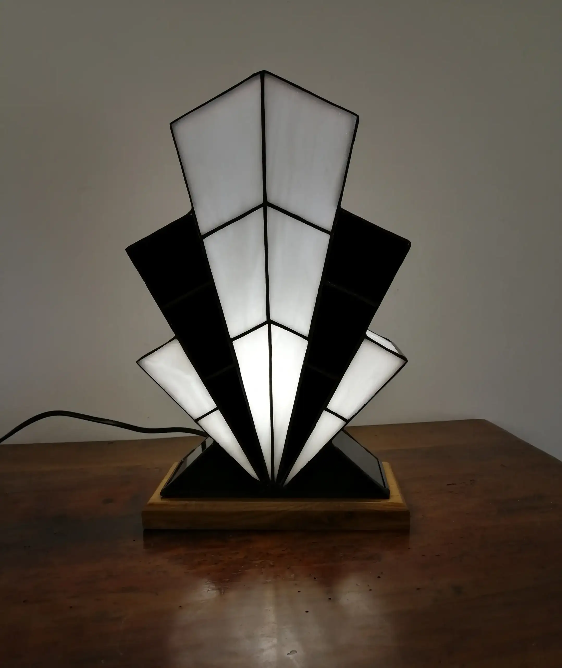 Lampe Art Déco en vitrail opalescent blanc et noir, entièrement réalisée à la main par une artiste-verrier. Verres opalescents à l’aspect poudré et vieilli pour une lumière douce et chaleureuse, contrastés par un verre noir opaque graphique. Socle en chêne massif sculpté, teinté chêne doré. Pièce unique, sculpturale et lumineuse, inspirée des arts décoratifs des années 1920.