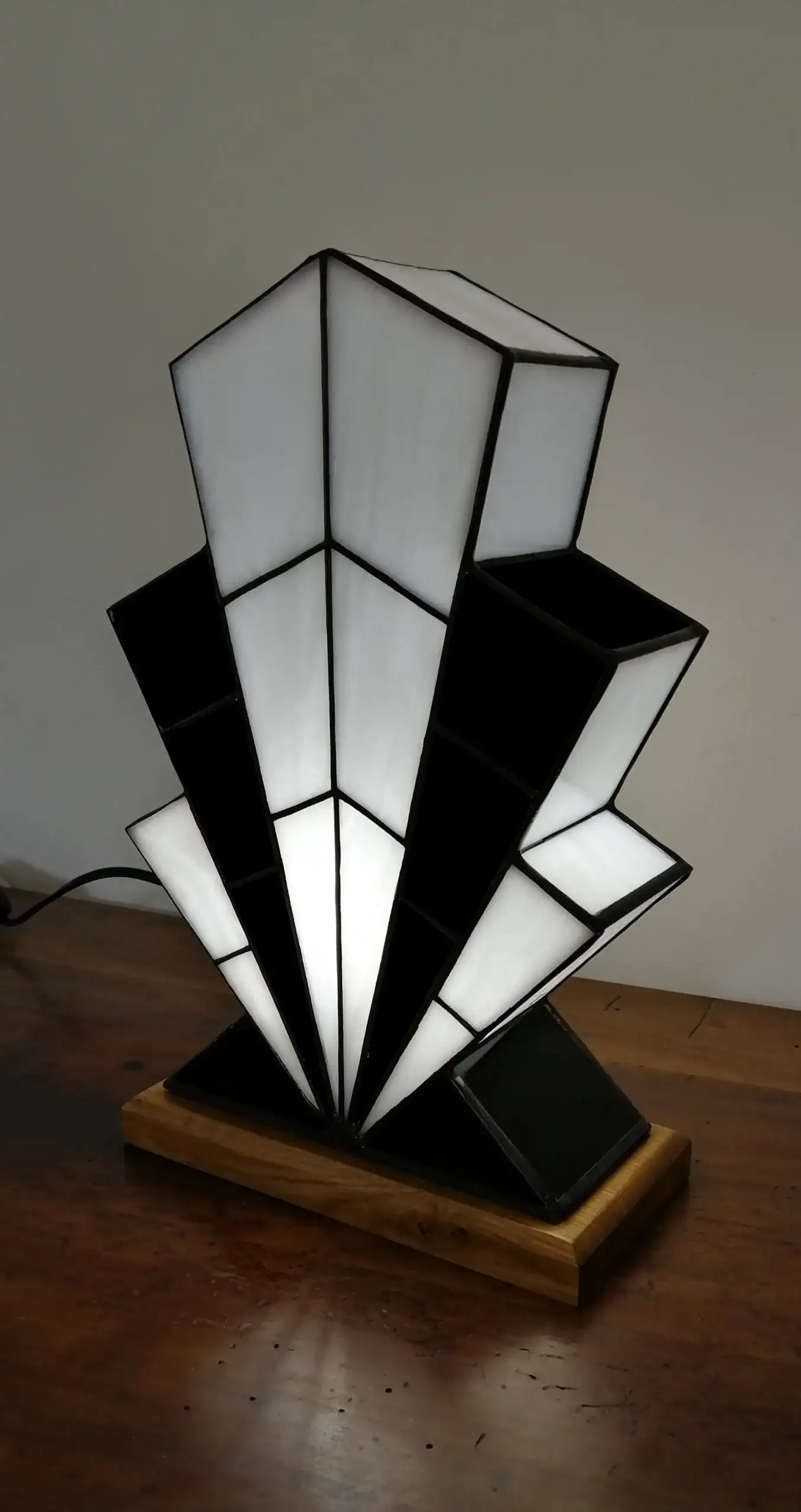 Dans le plus pur esprit Art Déco, je façonne cette lampe comme une sculpture lumineuse aux lignes géométriques affirmées. Les volumes anguleux et la composition architecturale s’inspirent directement des codes des années 1920, mouvement emblématique des arts décoratifs.