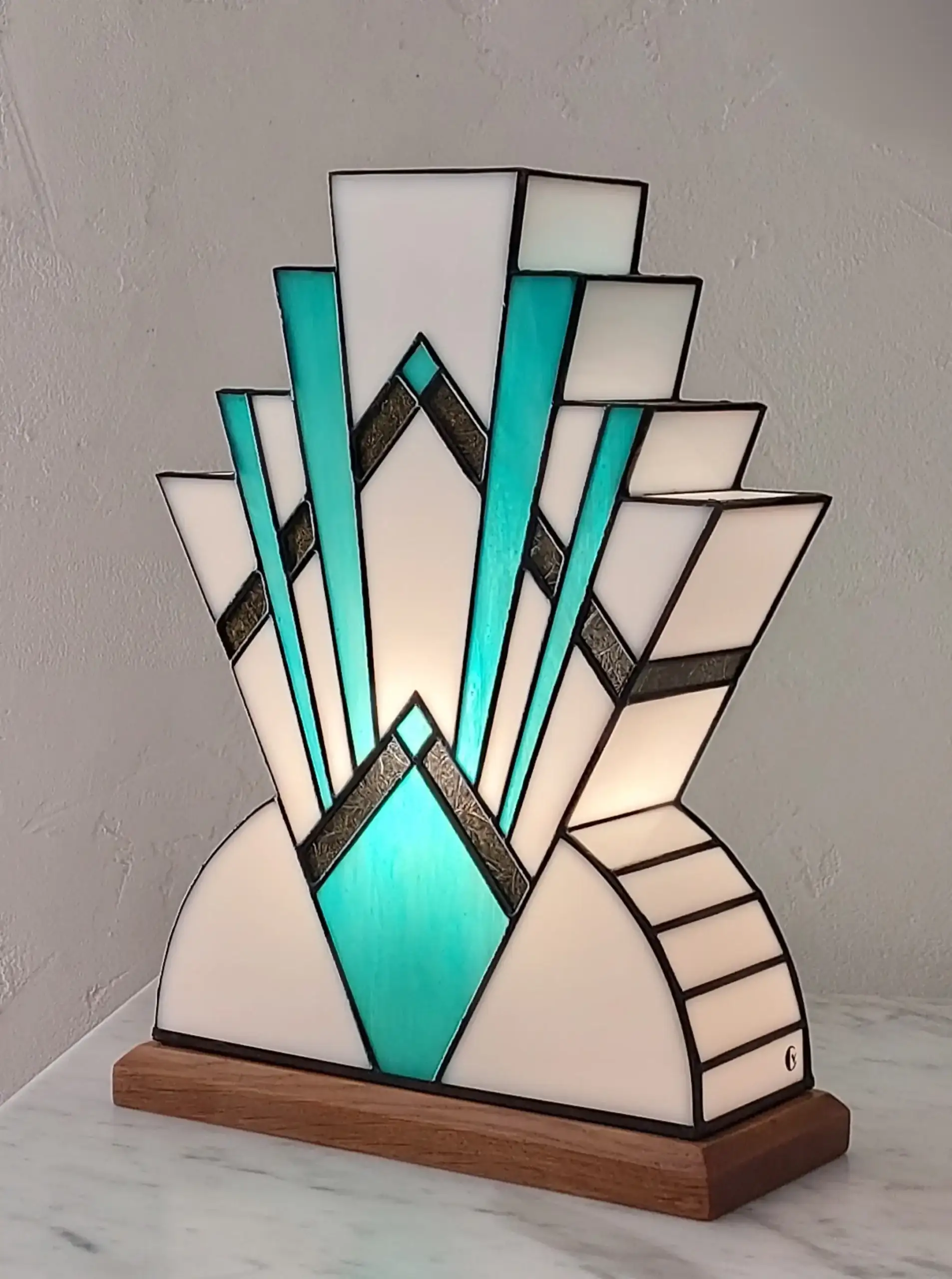 Je façonne chaque lampe Art déco en vitrail comme une pièce d’architecture lumineuse. Inspirée des années 1920–1930, cette création rend hommage au mouvement Art déco, reconnaissable à ses lignes géométriques, ses volumes en gradins et sa symétrie affirmée, caractéristiques de cette période artistique majeure.