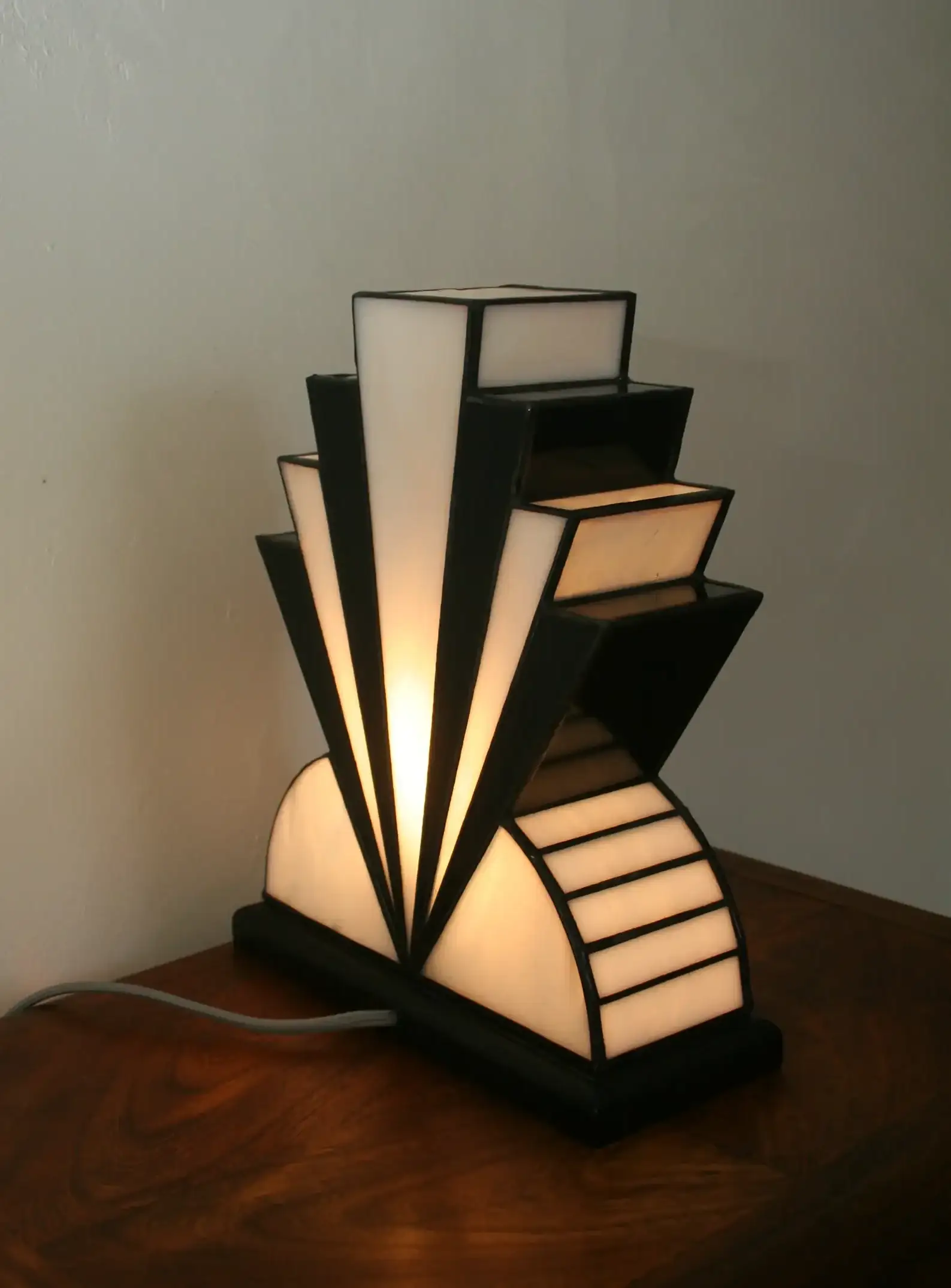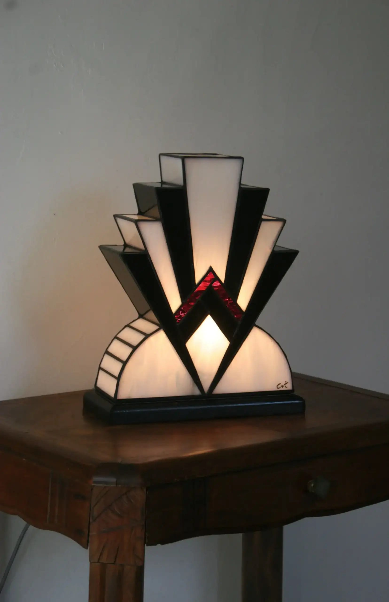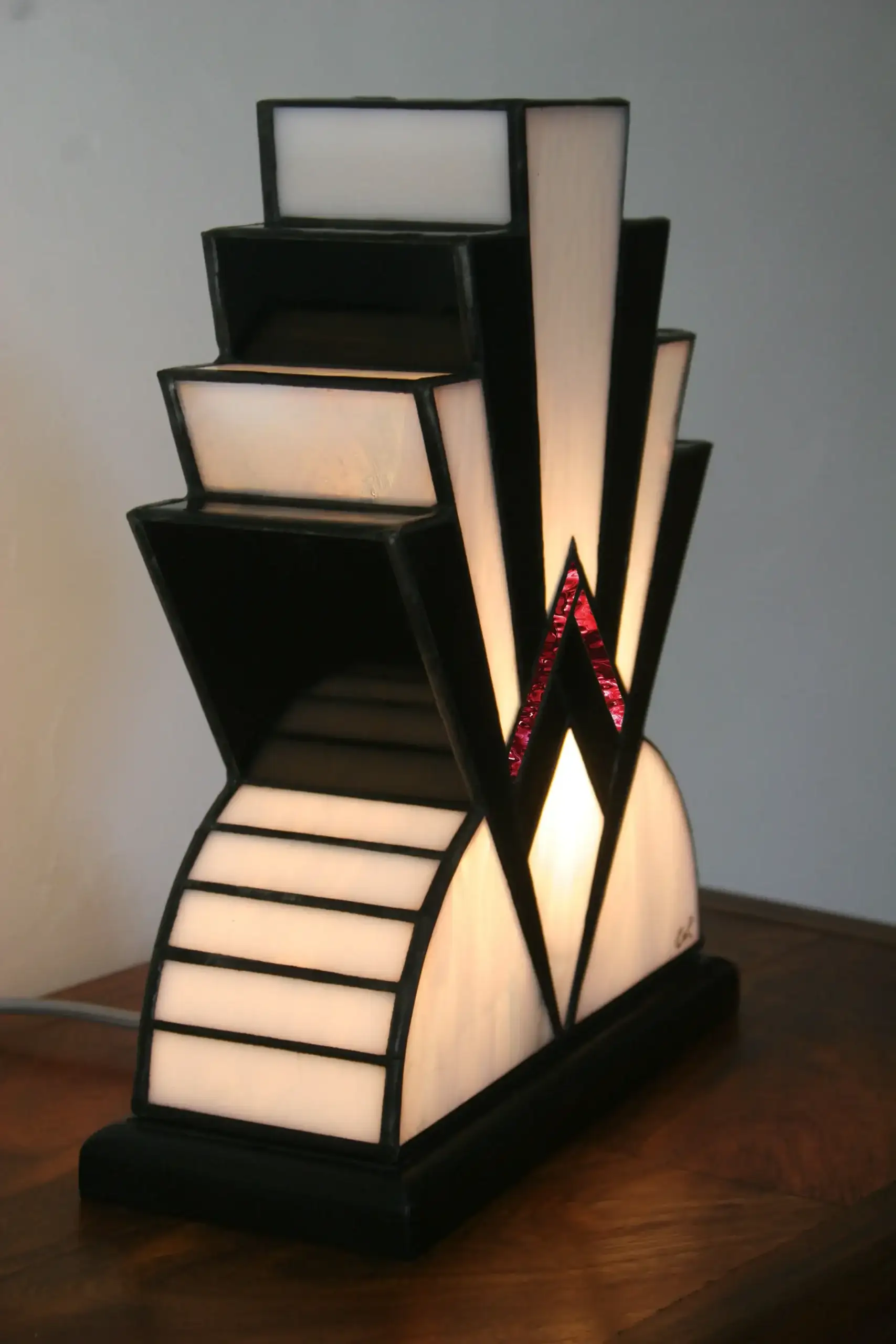Lampe Art Déco artisanale, réalisée à la main en vitrail Tiffany opalescent blanc, verre noir laqué texturé et touche de verre rouge.