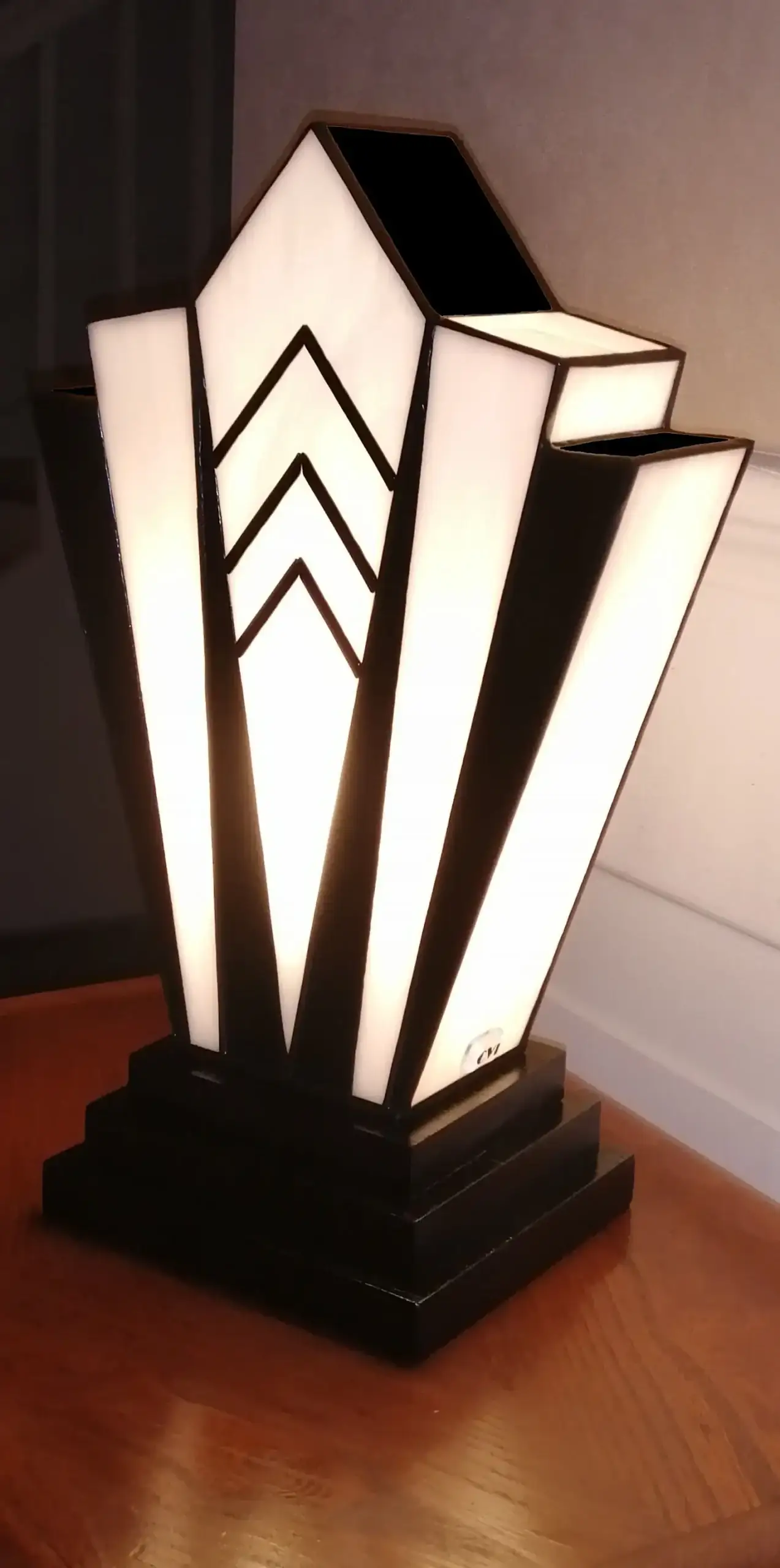 Créée dans mon atelier de verrière d’art, cette lampe Art Déco s’inspire des lignes architecturales emblématiques des années 1920. Le modèle « 1924 » se distingue par son dessin géométrique affirmé et son contraste élégant entre verre opalescent blanc perle et verre noir brillant, pour une lumière à la fois graphique et apaisante.
