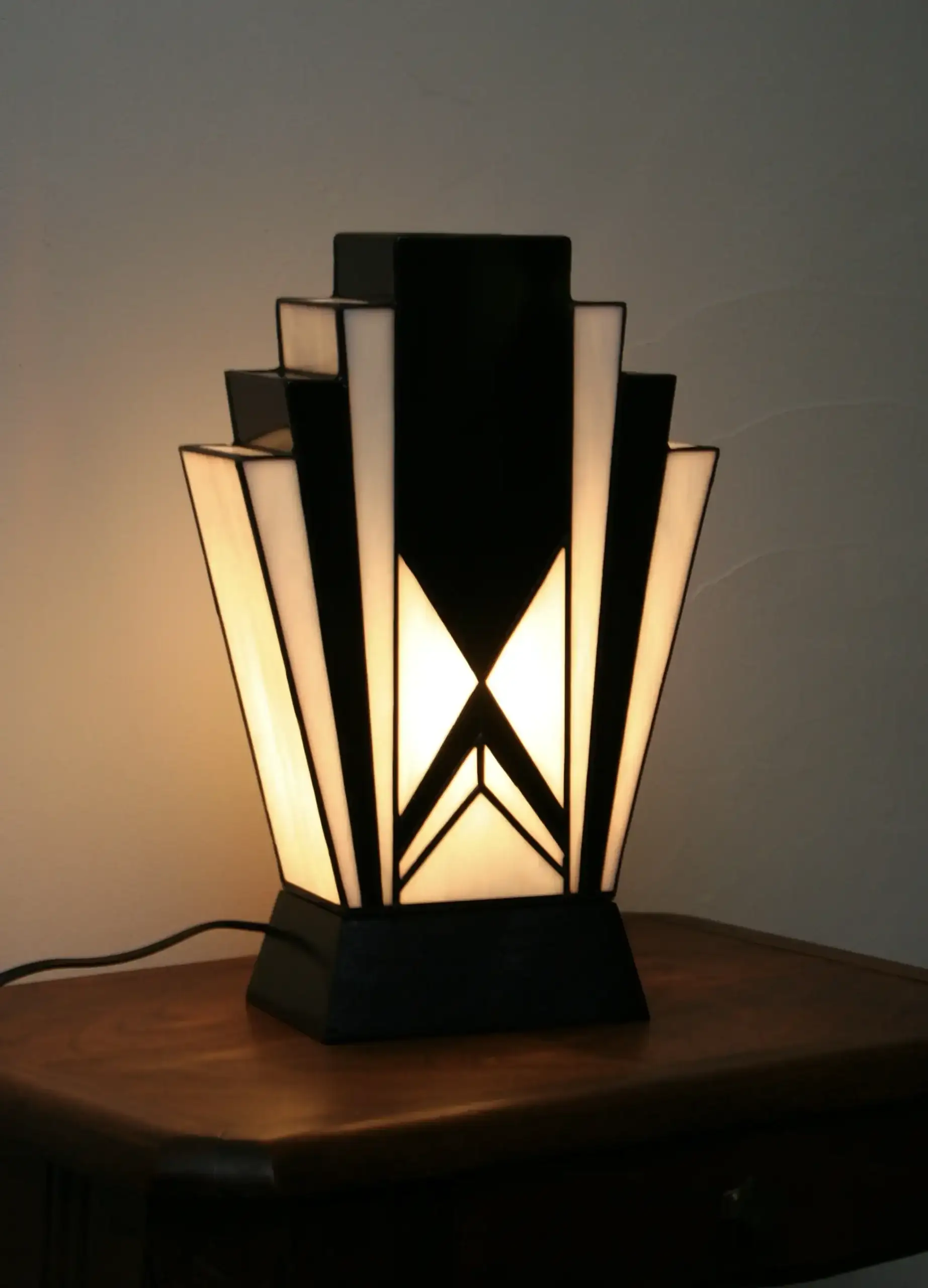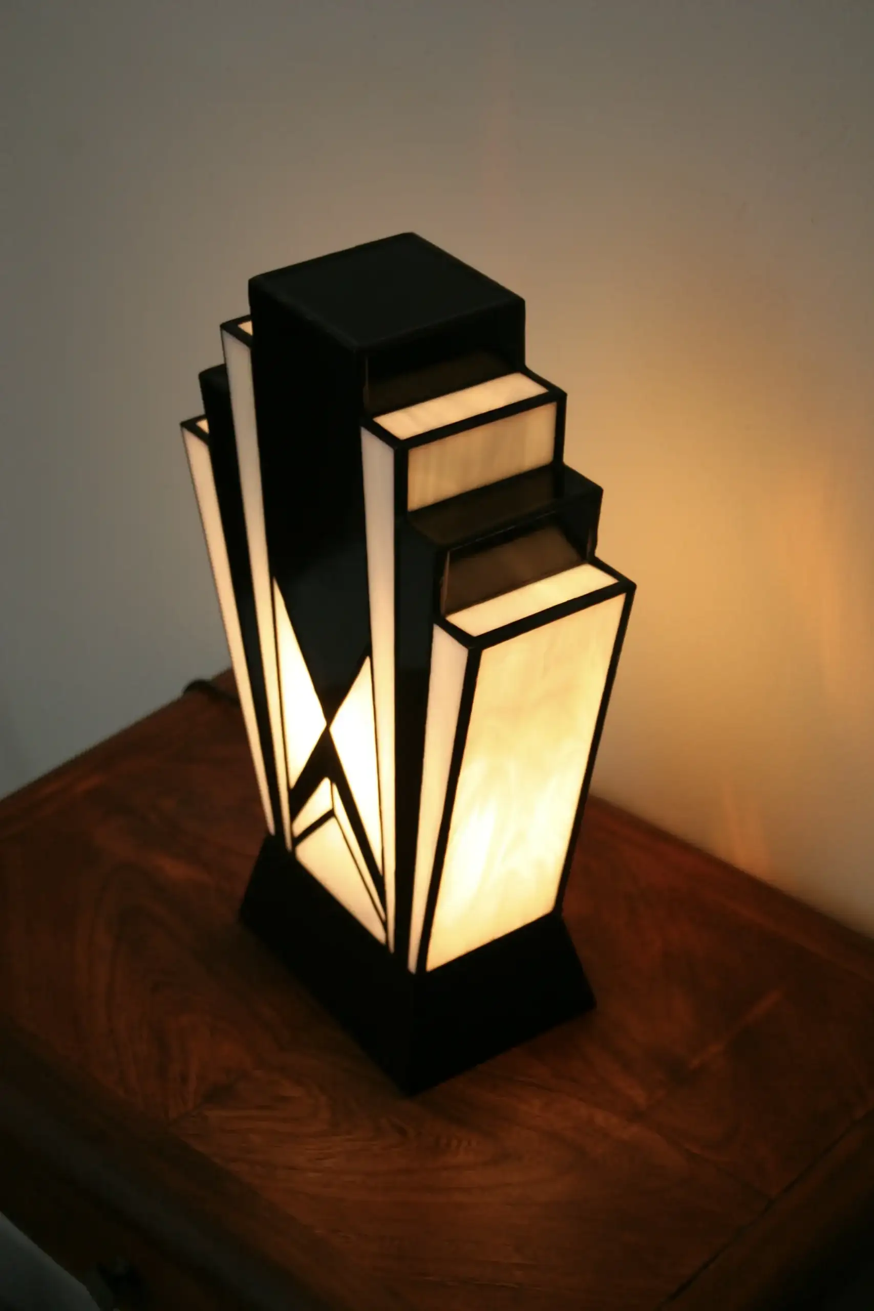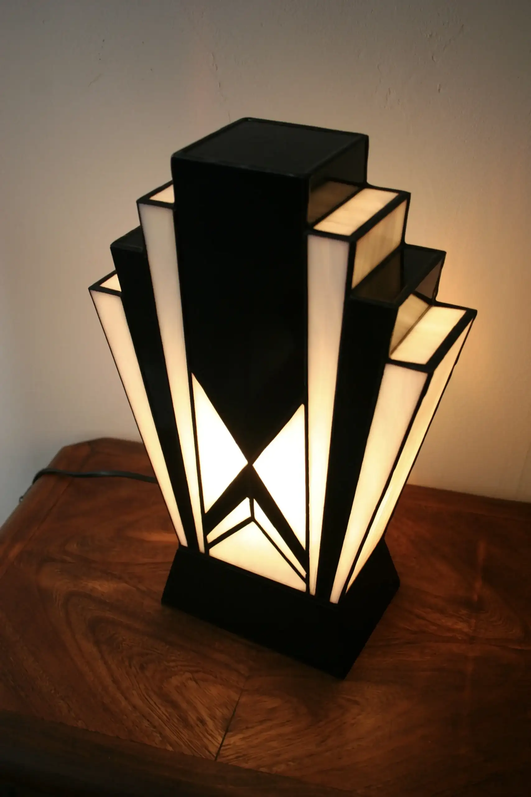 Dans mon atelier d’artiste-verrier, je façonne cette lampe d’art Art Déco comme une sculpture lumineuse. Les verres opalescents blanc pur, choisis pour leur forte diffusion lumineuse, sont associés à un verre noir glacé aux lignes nettes et graphiques. L’ensemble compose un jeu de contrastes élégant, révélant une lumière intense mais douce, structurée par la géométrie du verre.