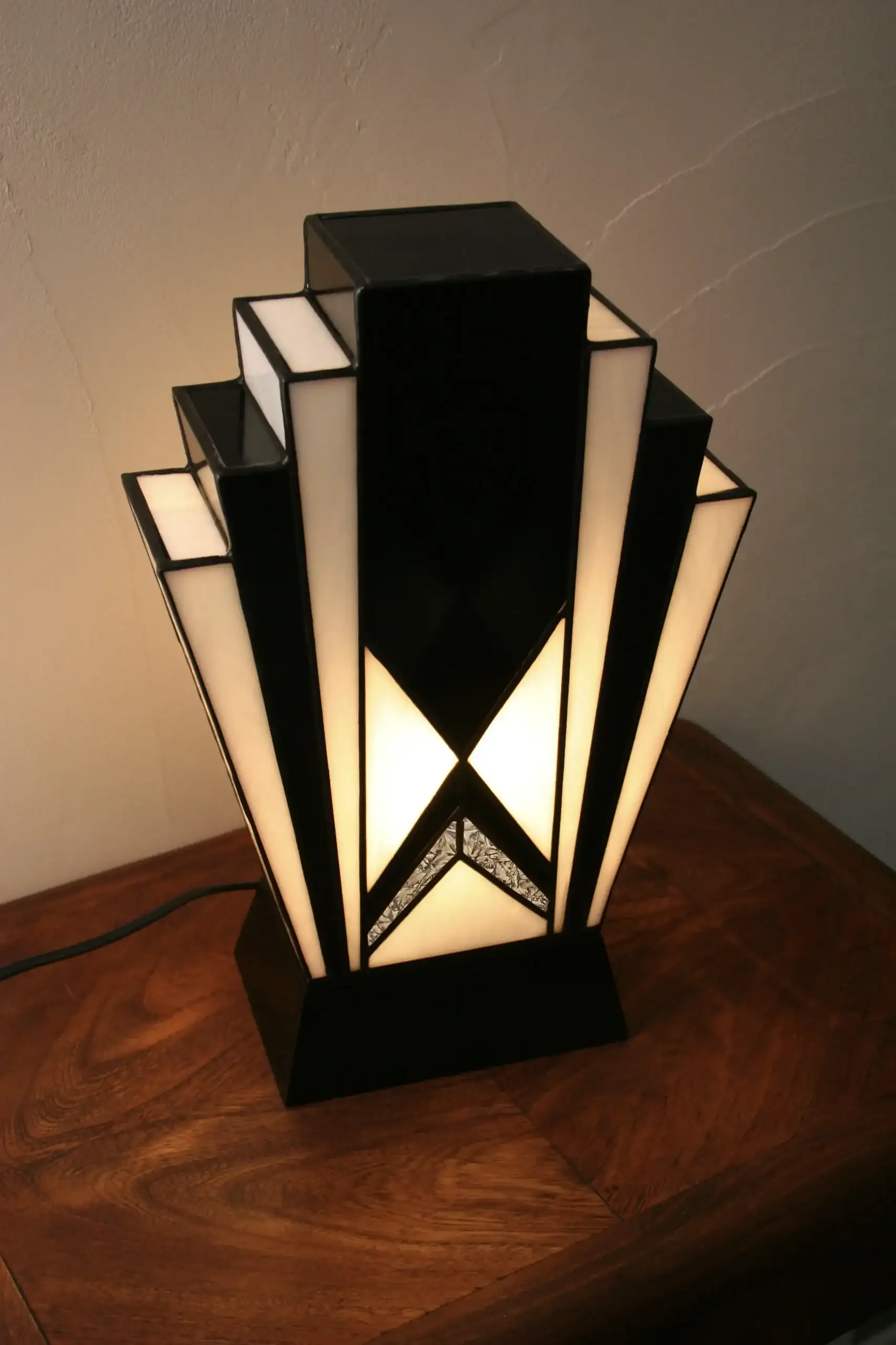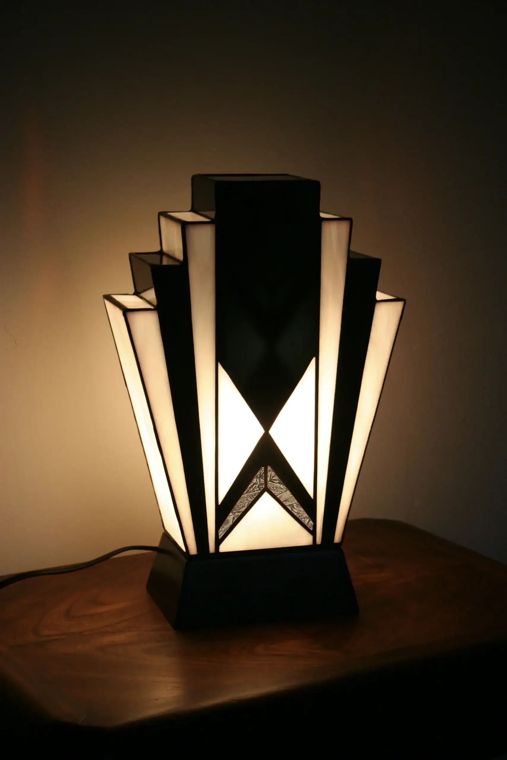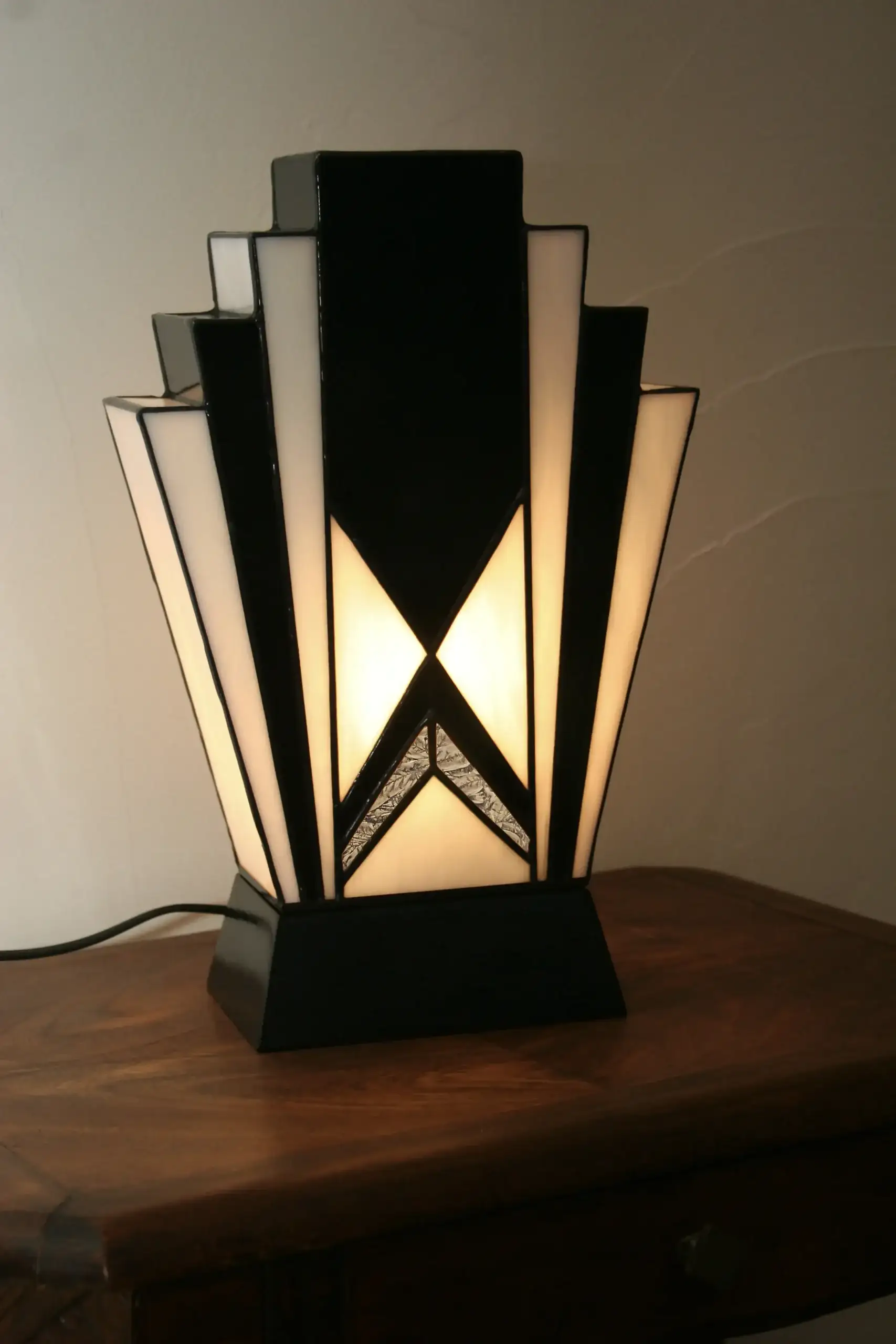 Lampe Art Déco en vitrail Tiffany aux verres opalescents blanc perle et noir glacé, soulignée d’une touche de verre or. Socle en chêne massif sculpté, création artisanale diffusant une lumière douce et chaleureuse.