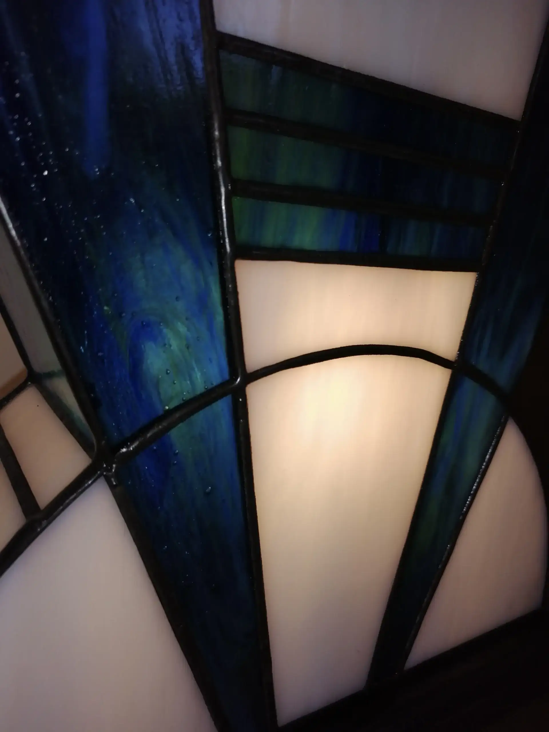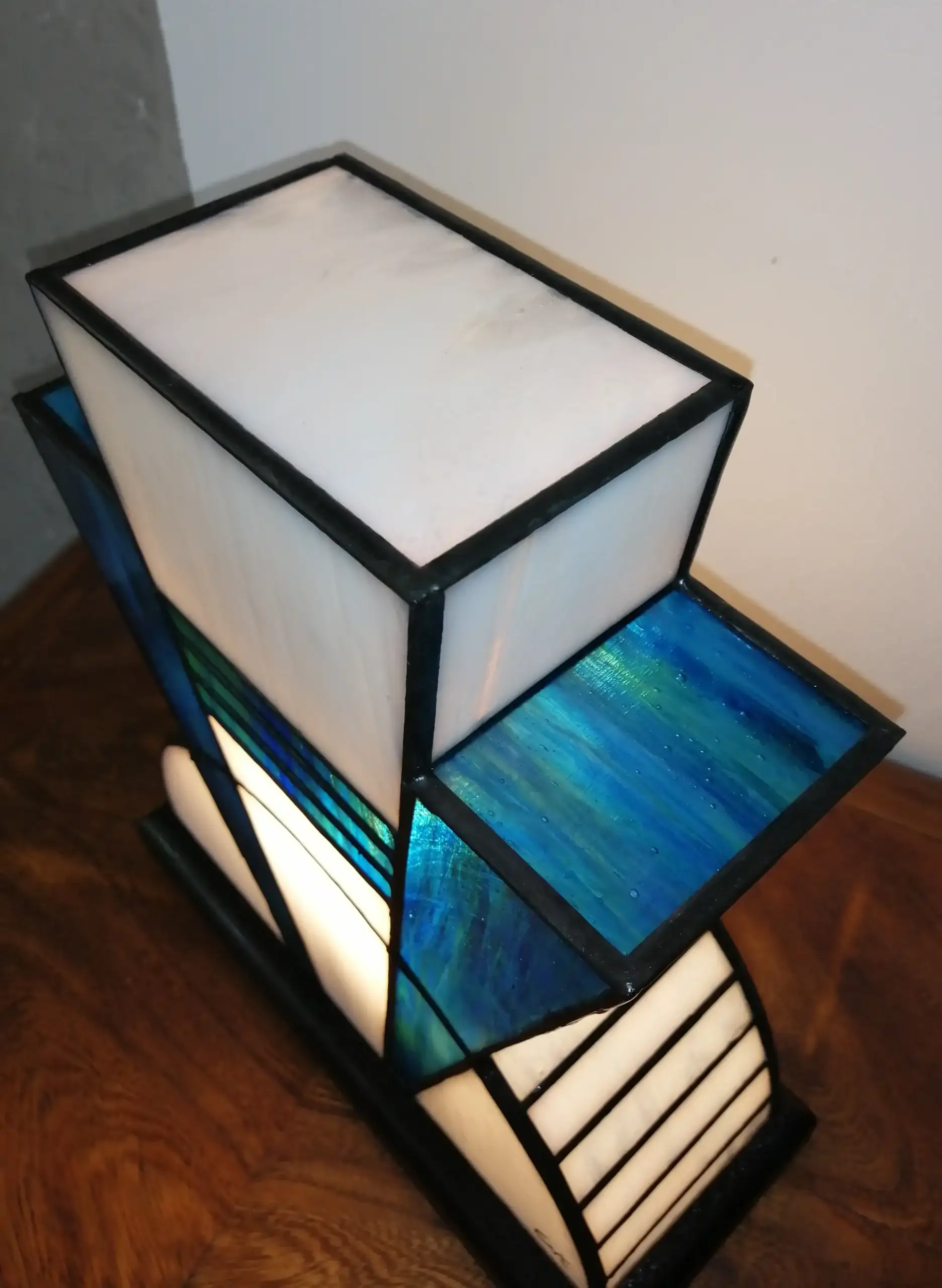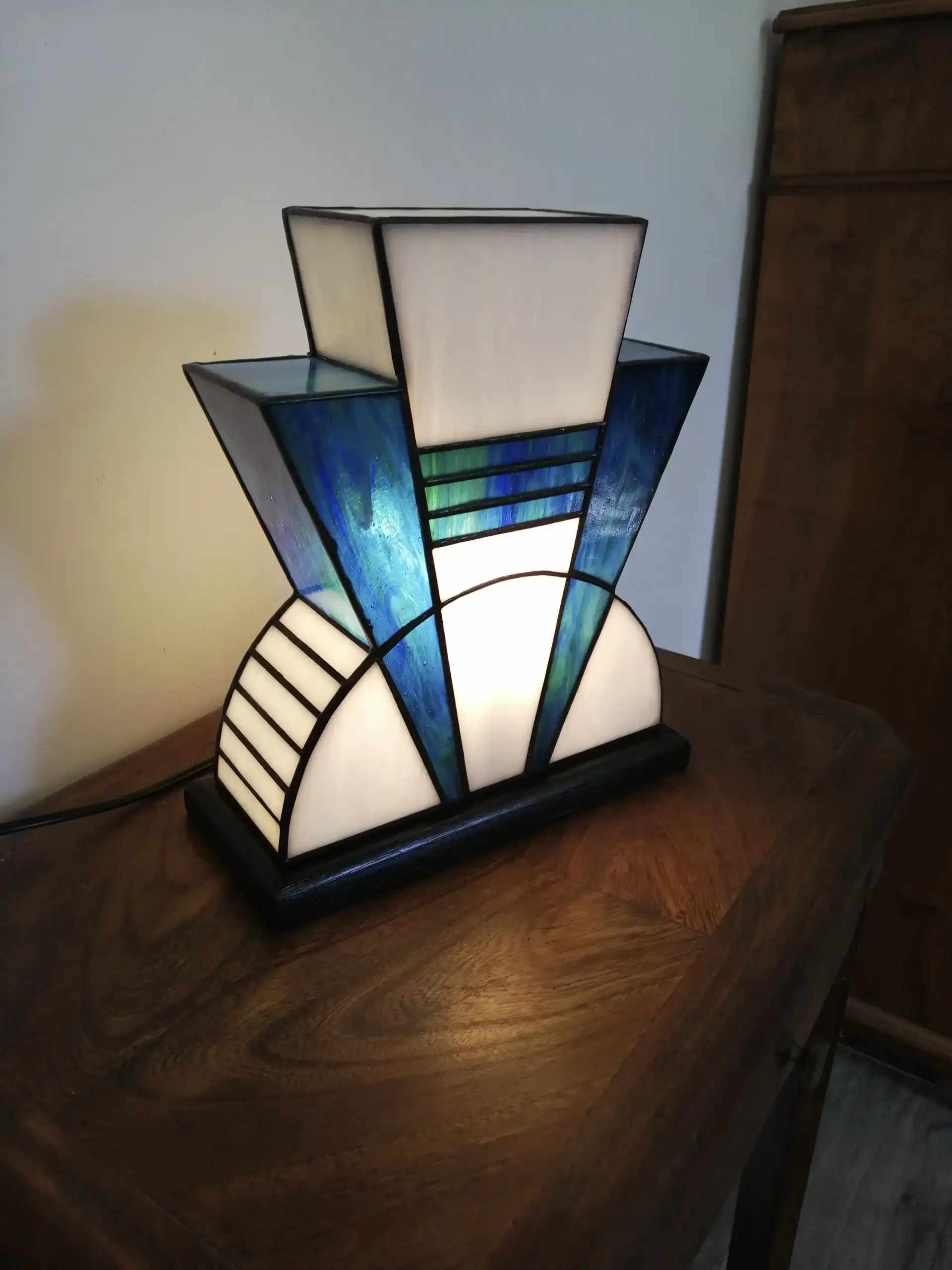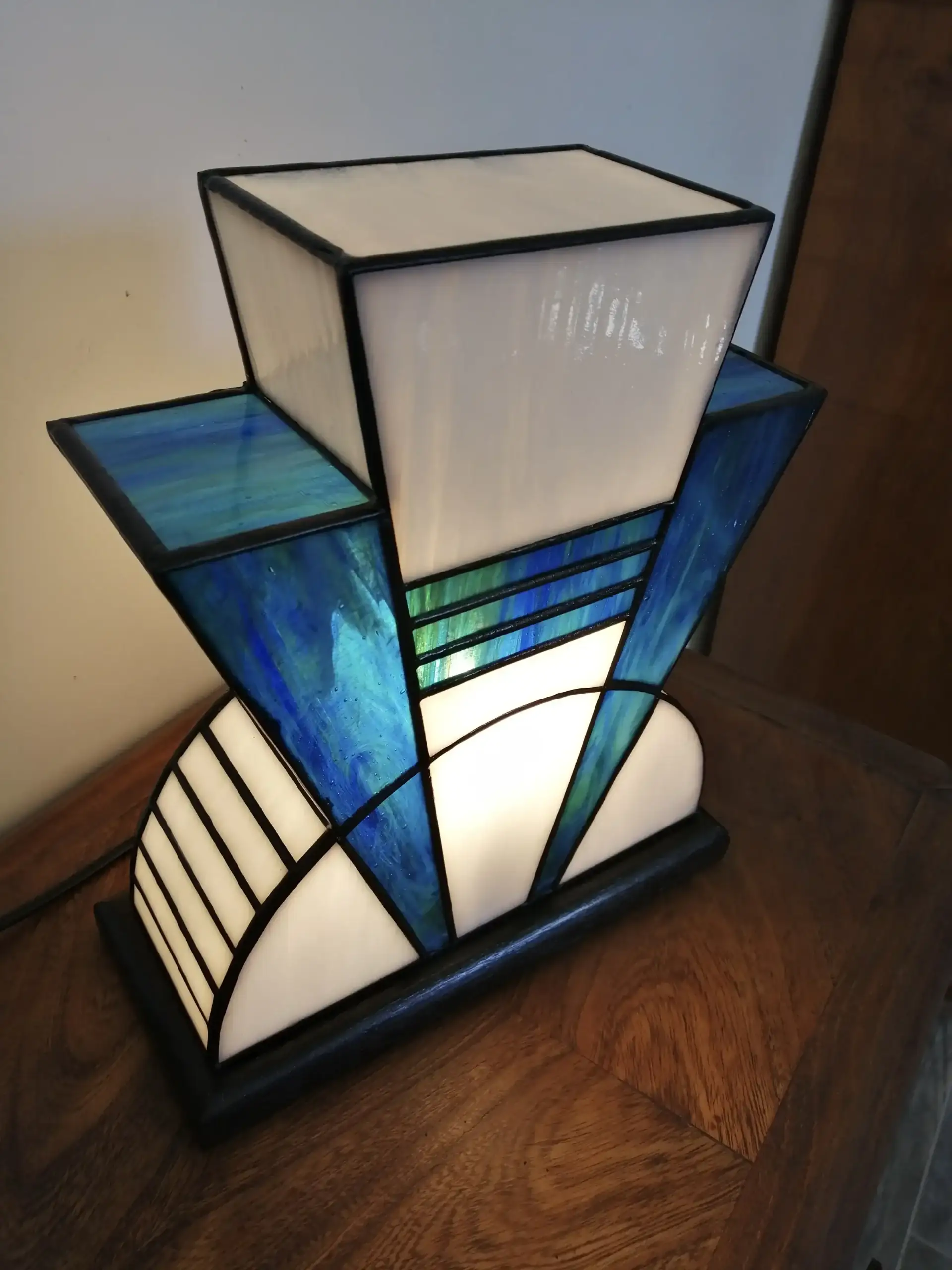 L’alliance du blanc et du bleu crée une lampe en vitrail à la fois graphique, moderne et intemporelle, idéale pour une décoration intérieure élégante.
