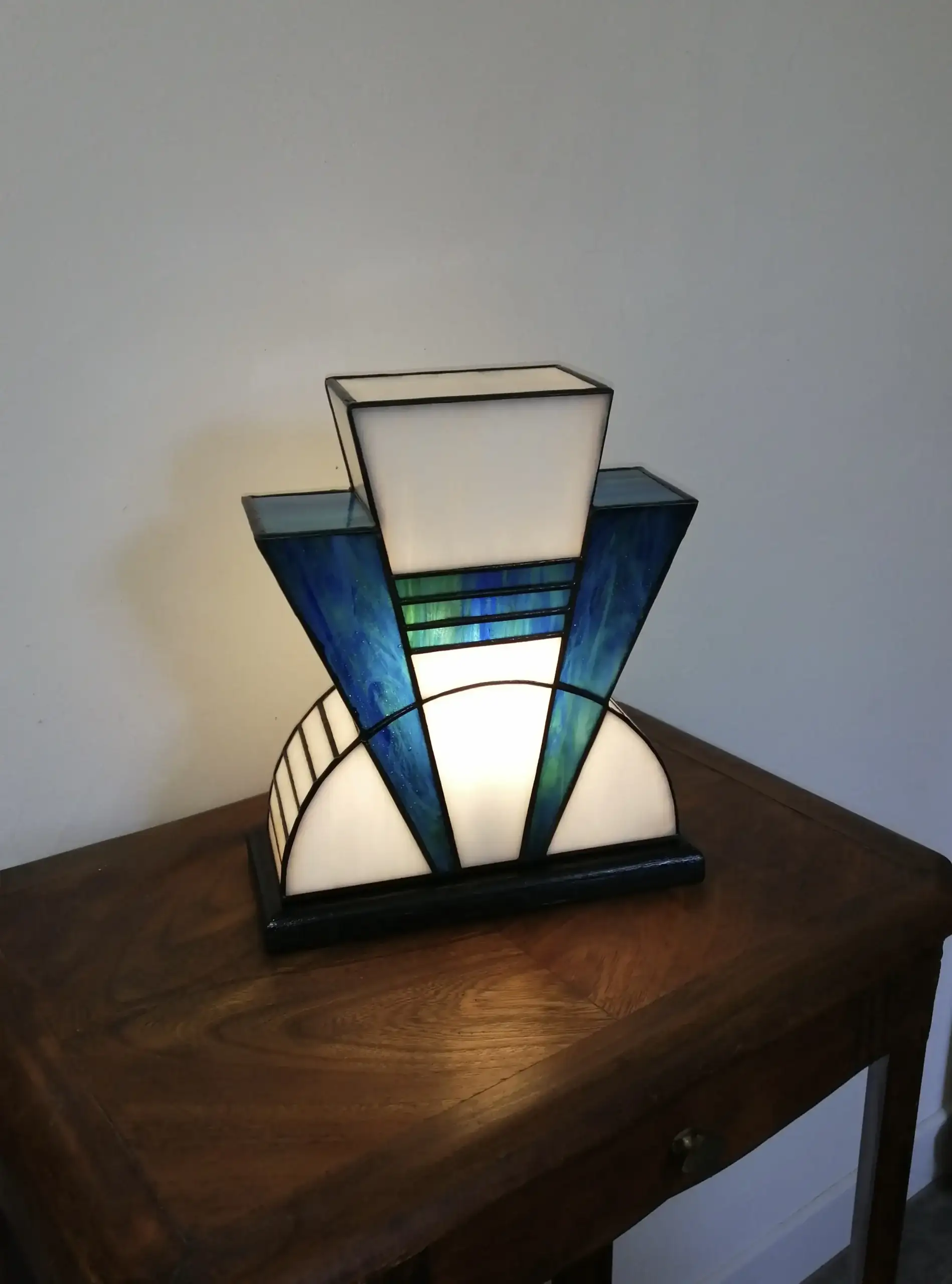 Création artisanale en véritable vitrail Tiffany, inspirée des lignes géométriques emblématiques des années 1920. Cette lampe Art Déco associe la pureté lumineuse du blanc opalescent à la profondeur vibrante d’un bleu lagon intense, pour une atmosphère chaleureuse et raffinée.