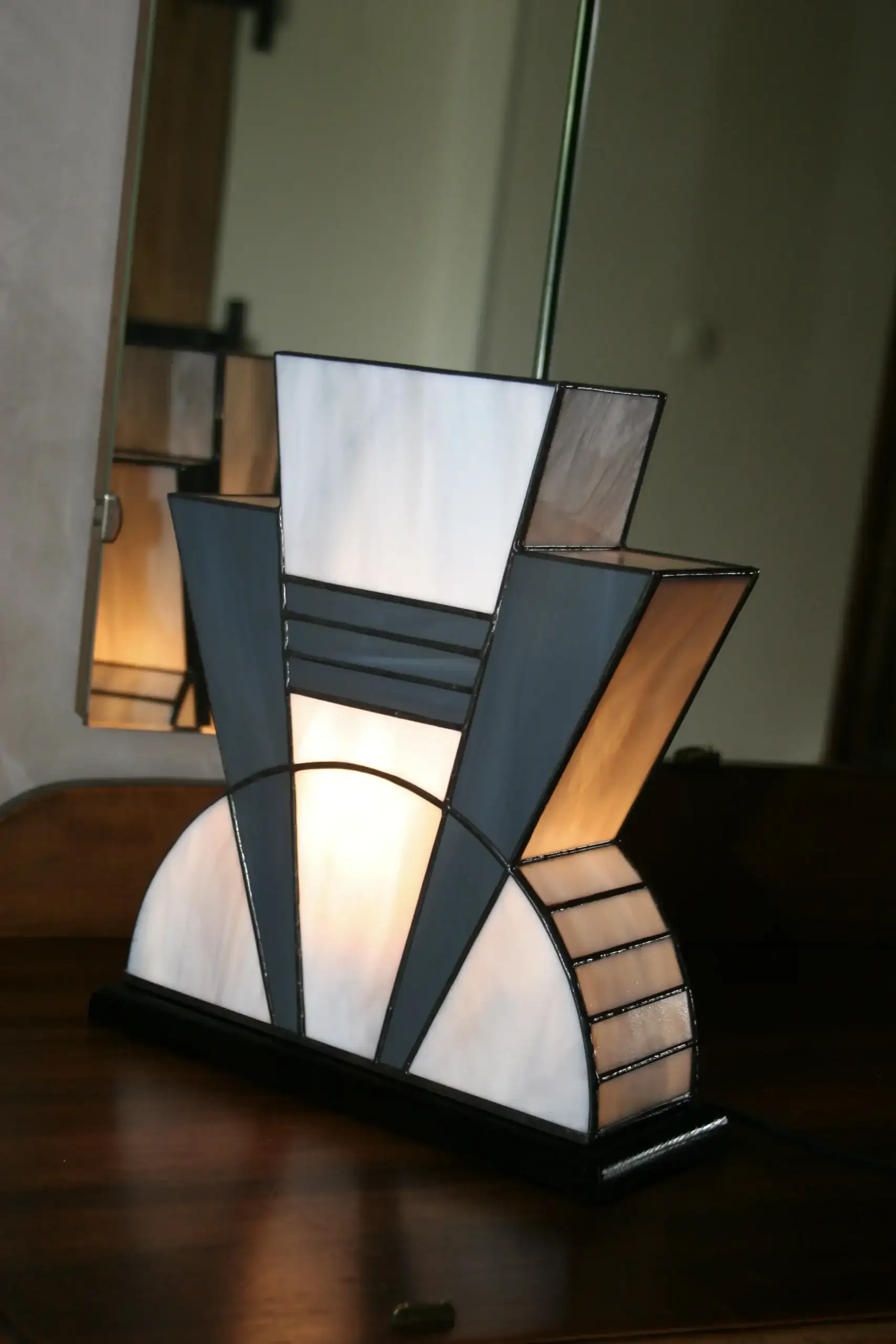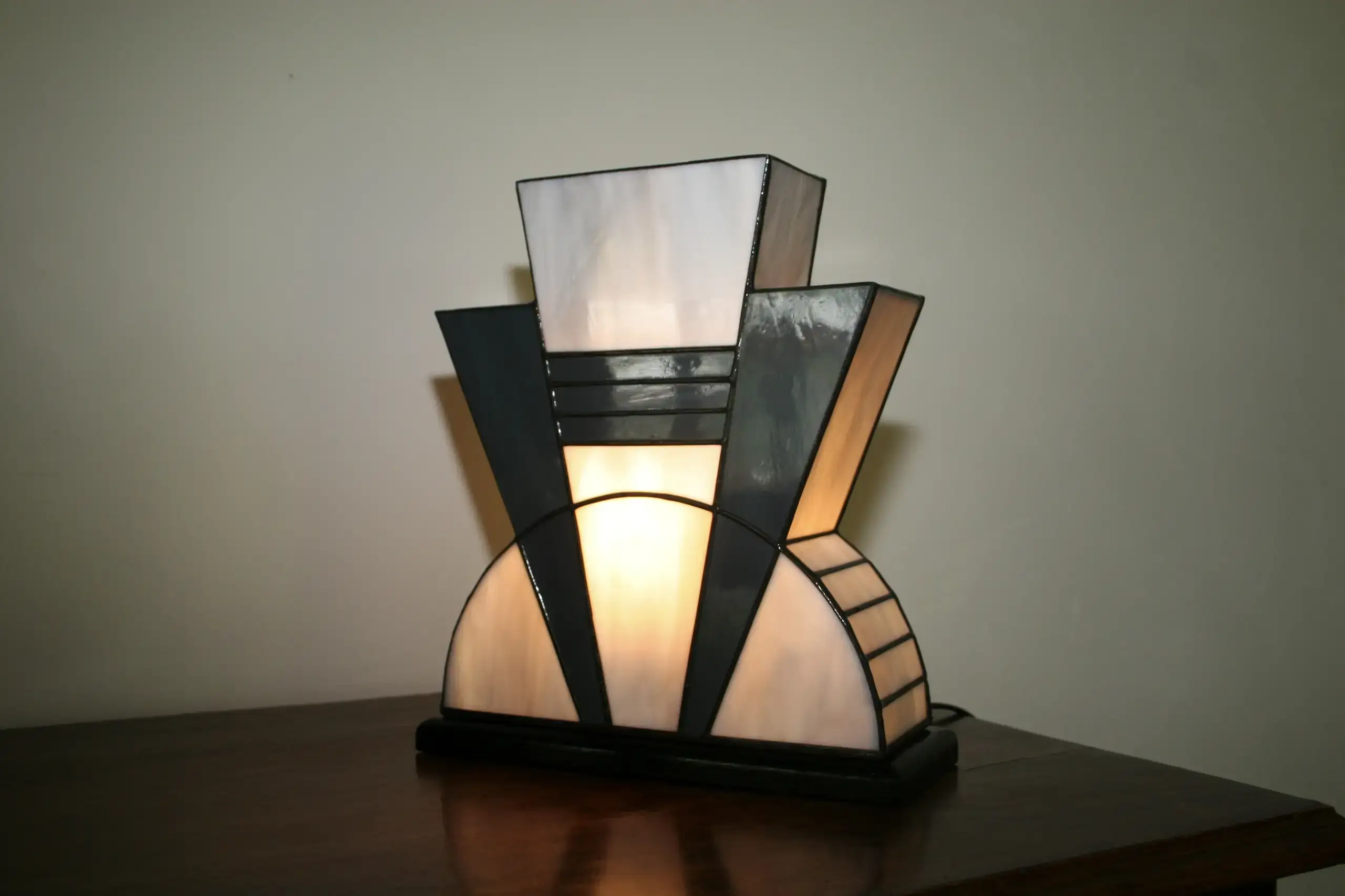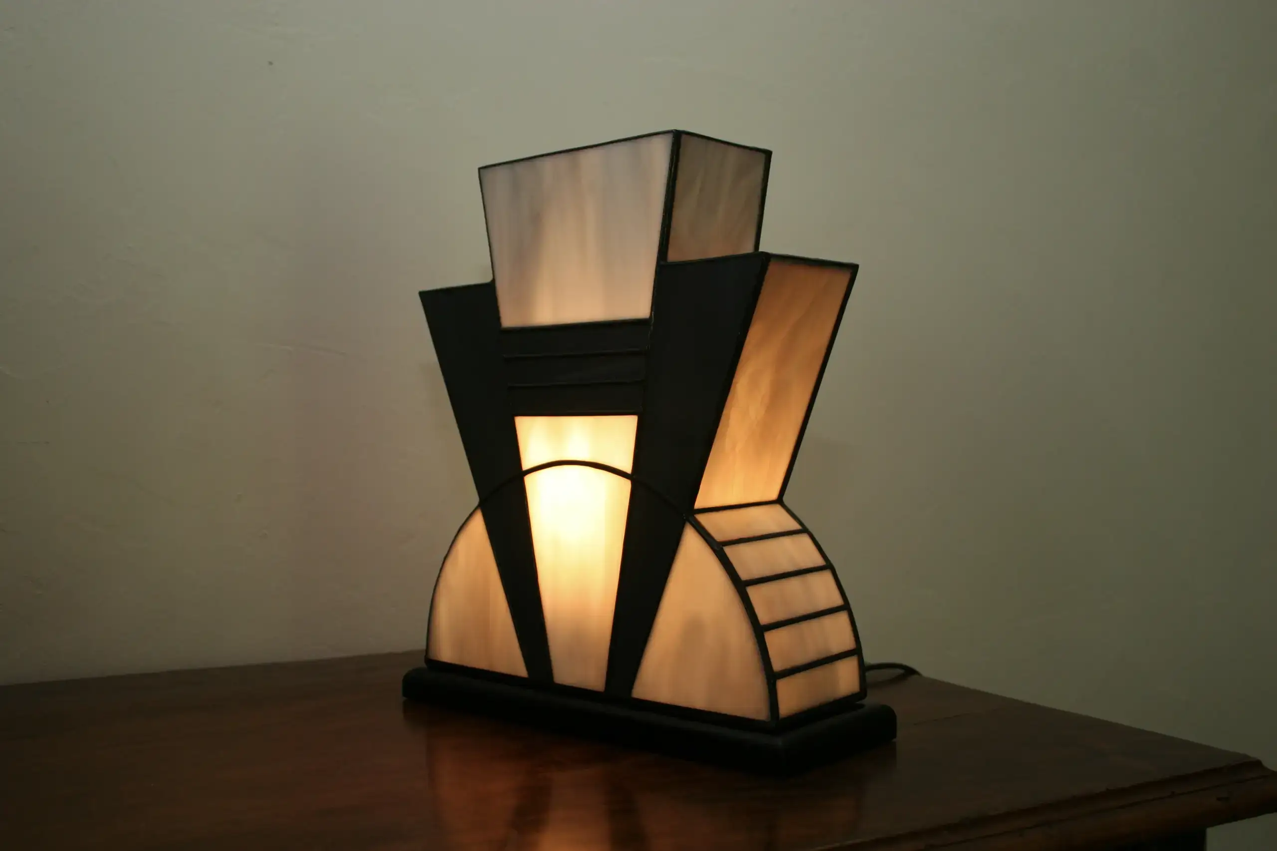 Création artisanale en vitrail Tiffany réalisée à la main dans mon atelier d’artiste-verrier. Le modèle « Mineral » s’inspire de l’élégance géométrique des années 1920, au cœur du mouvement Art Déco.
