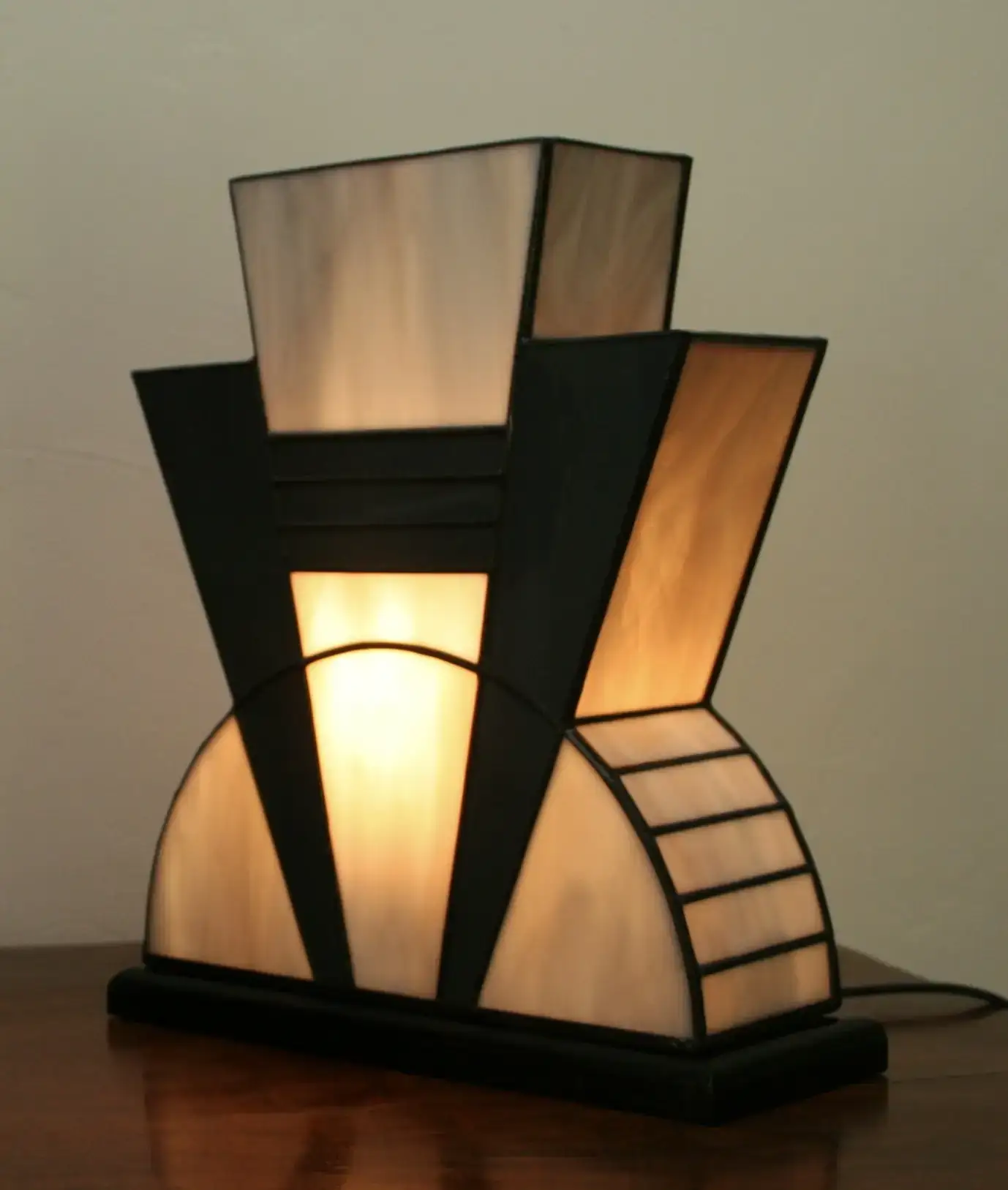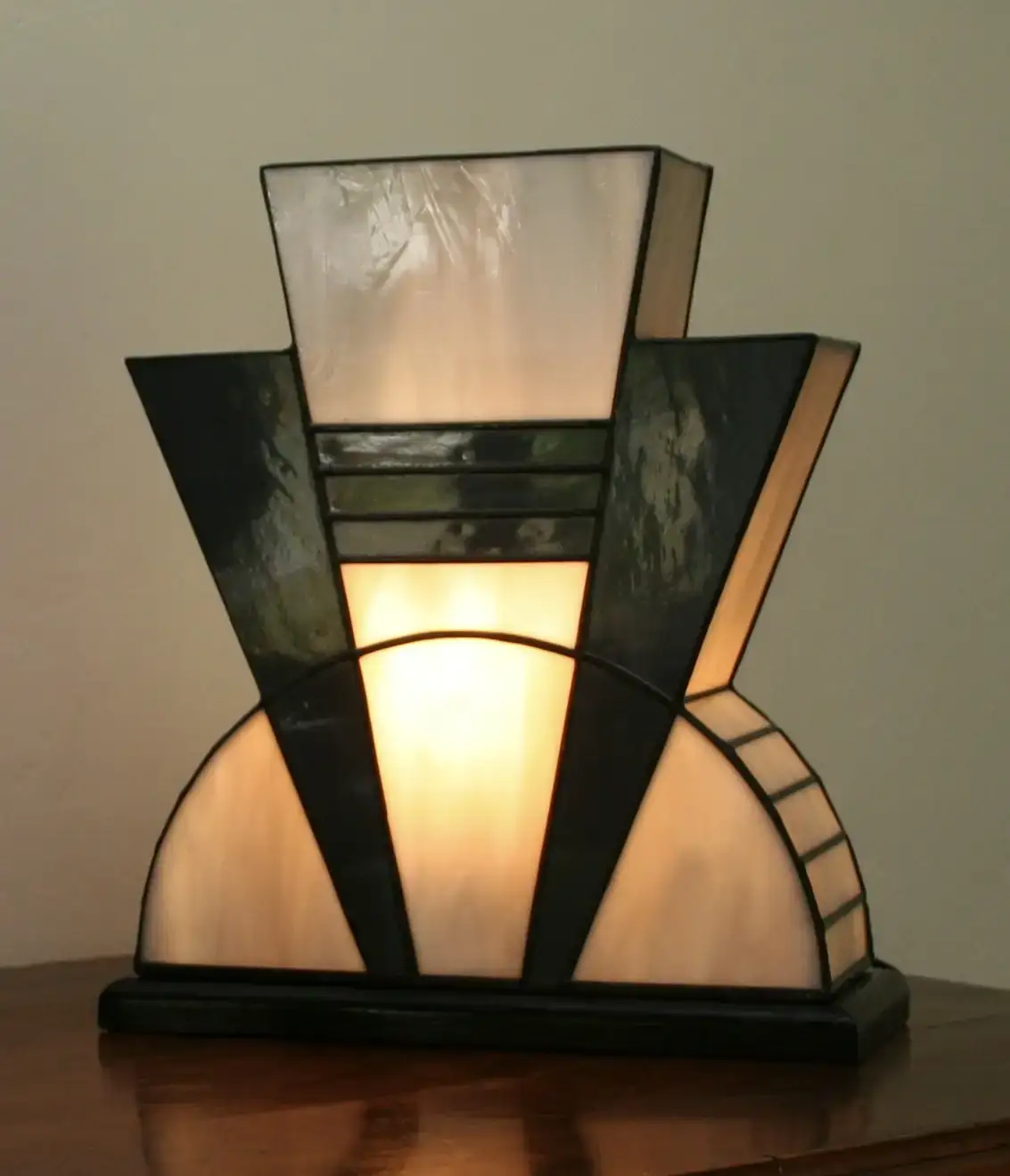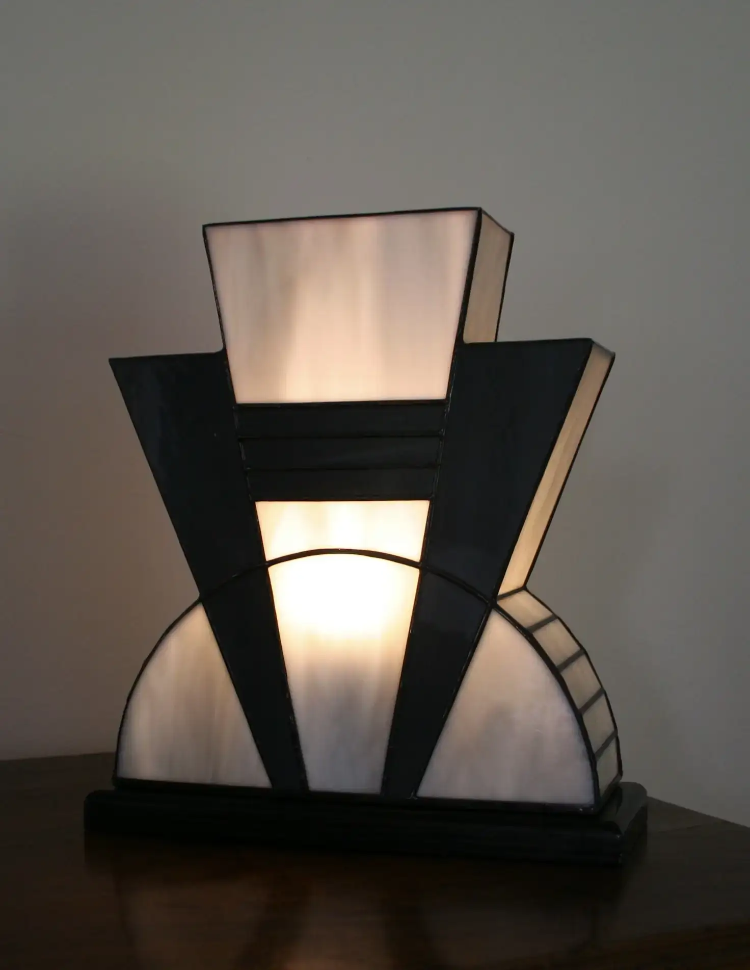 Création artisanale en vitrail Tiffany réalisée à la main dans mon atelier d’artiste-verrier. Le modèle « Mineral » s’inspire de l’élégance géométrique des années 1920, au cœur du mouvement Art Déco.