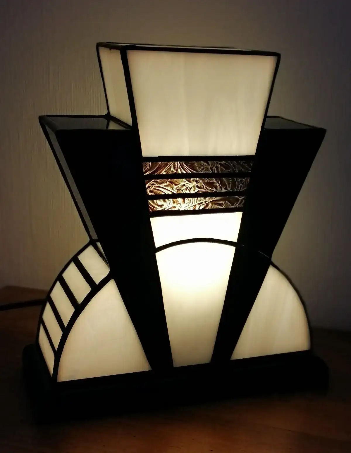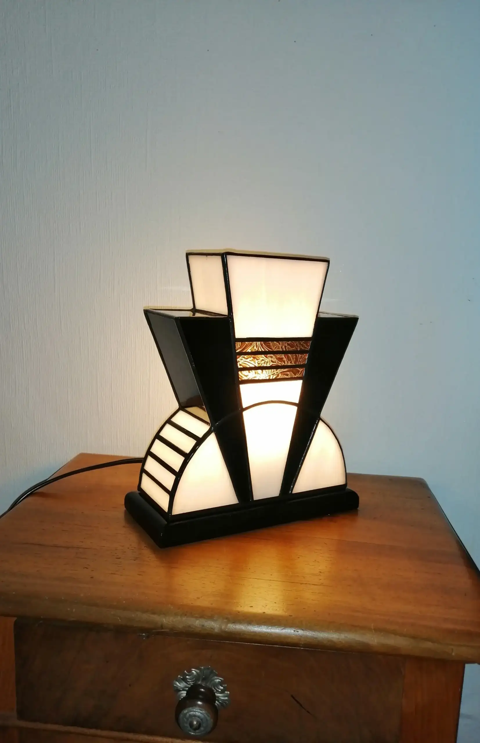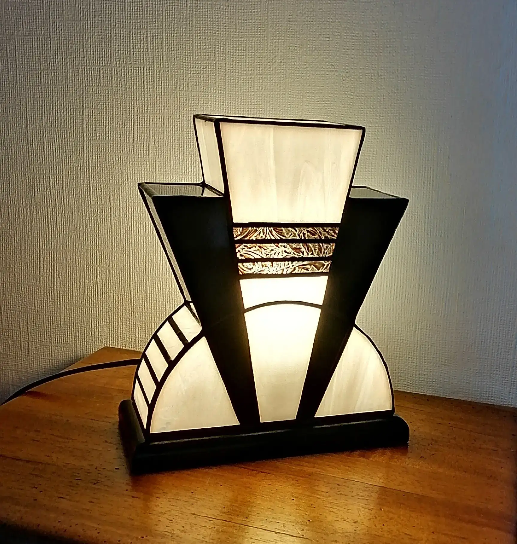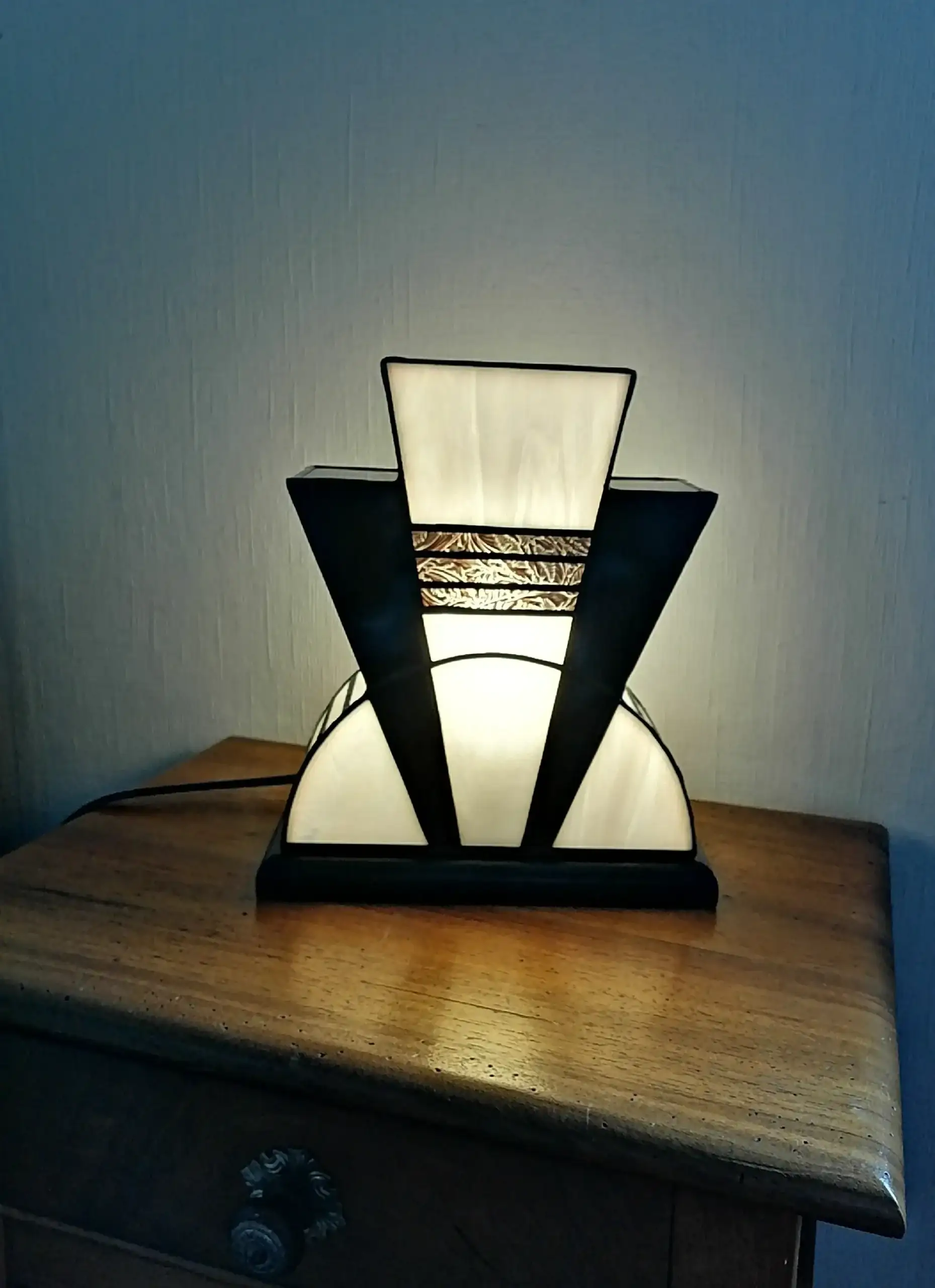 Lampe en véritable vitrail Tiffany réalisée à la main dans mon atelier d’artiste-verrier. Cette création Art Déco associe un verre opalescent blanc pur très lumineux à un noir glacé profond, sublimés par une incrustation de verre doré ancien à motif de palmettes, typique des années 1920.