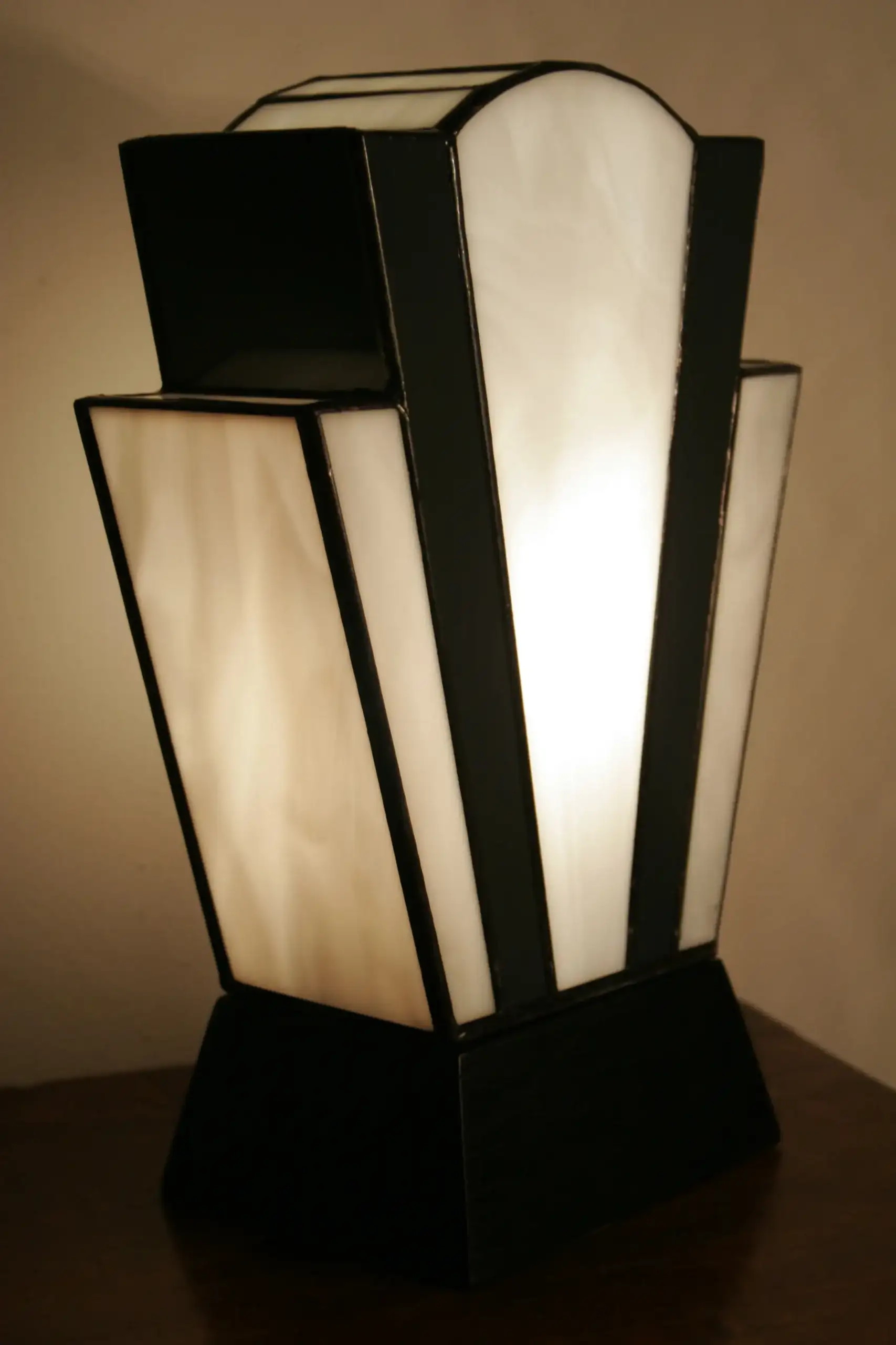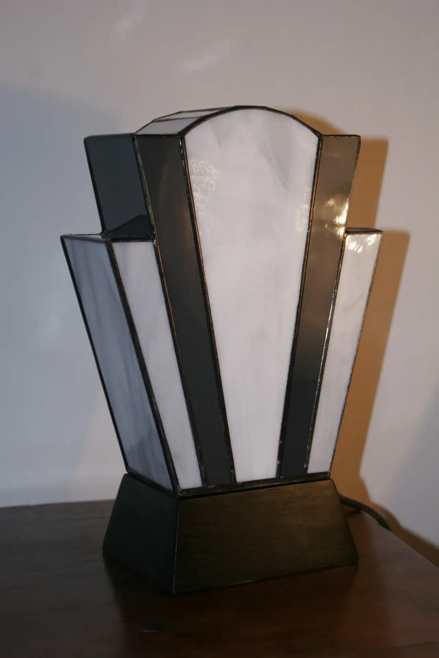 Lampe vitrail artisanale inspirée de l’esthétique Art Déco des années 1920. Cette création associe des verres opalescents gris perle et gris foncé qui diffusent une lumière douce et minérale. Les lignes géométriques structurées rappellent l’architecture et le design caractéristiques de l’Art Déco.
