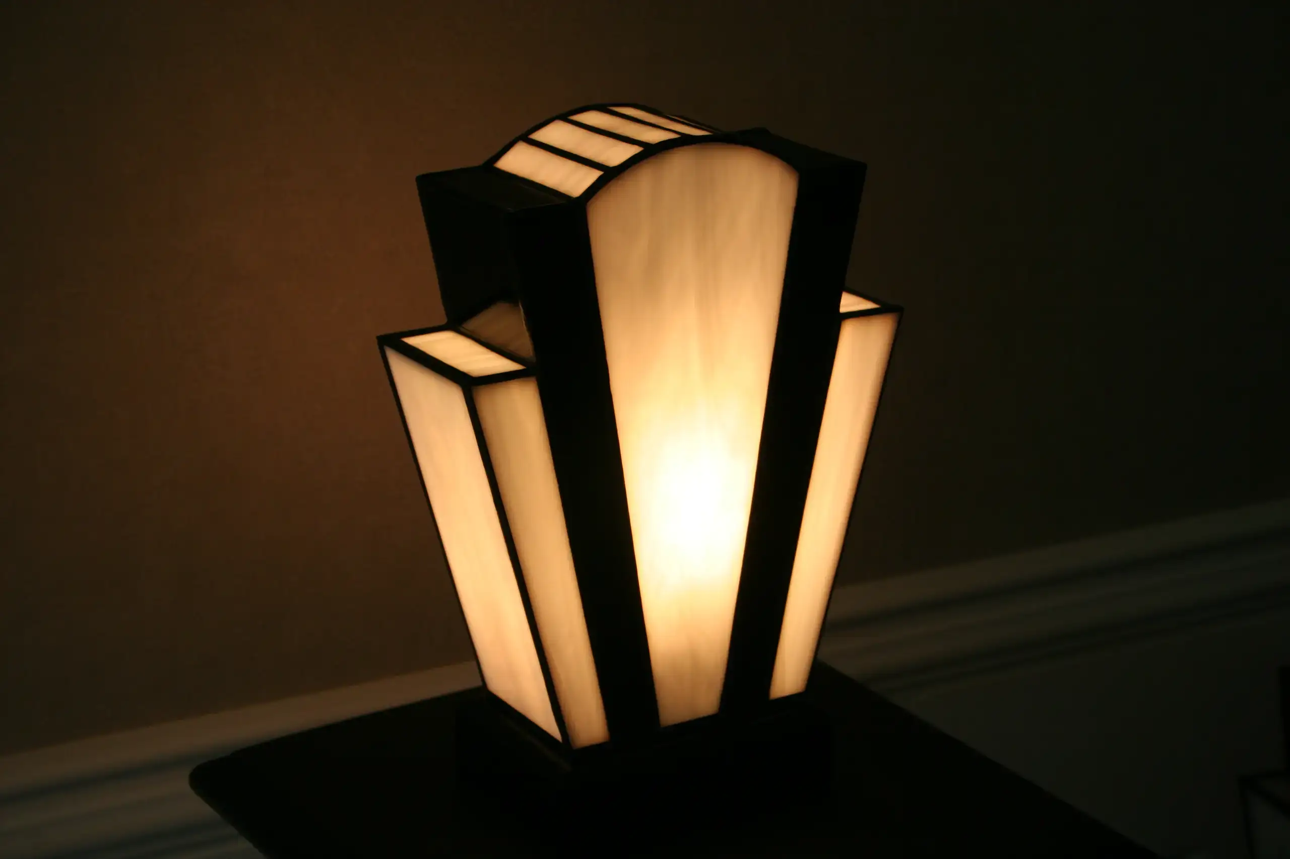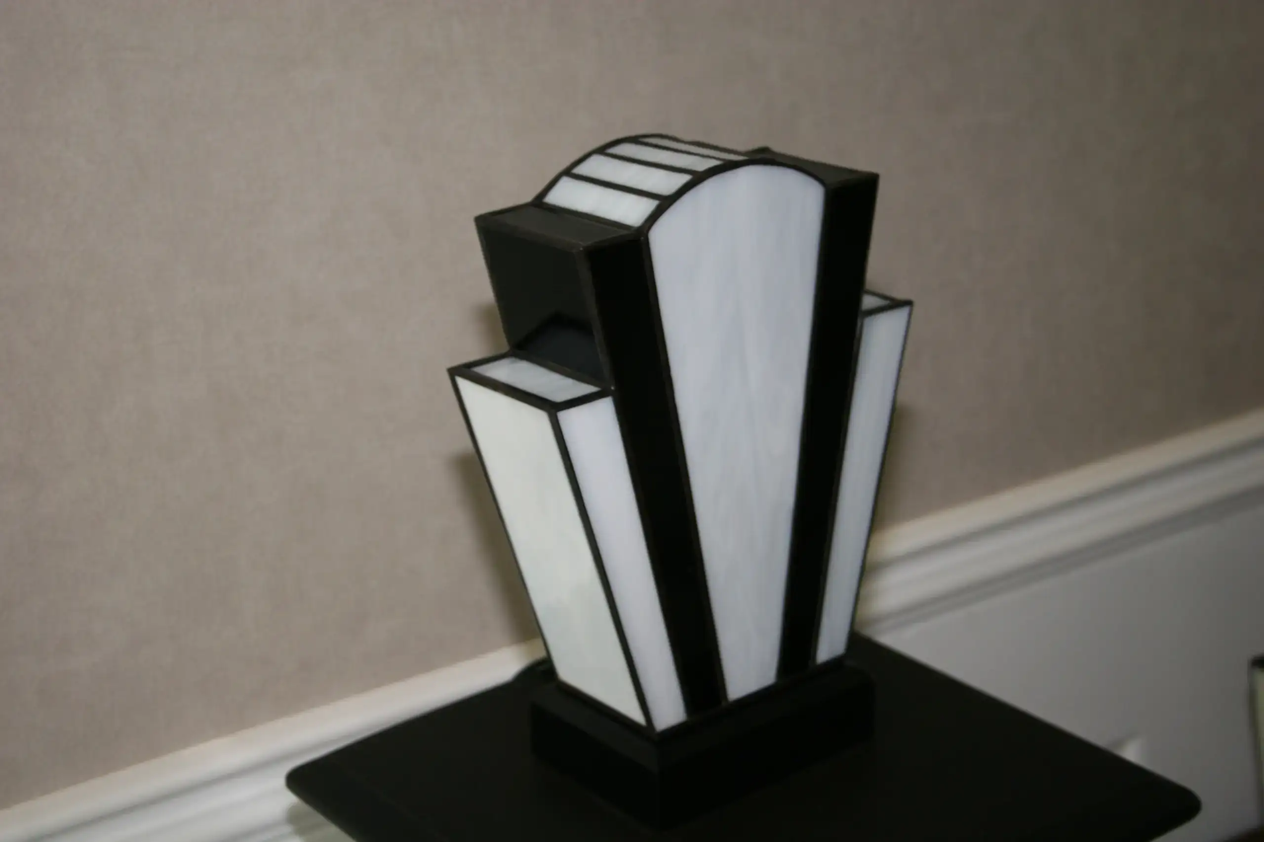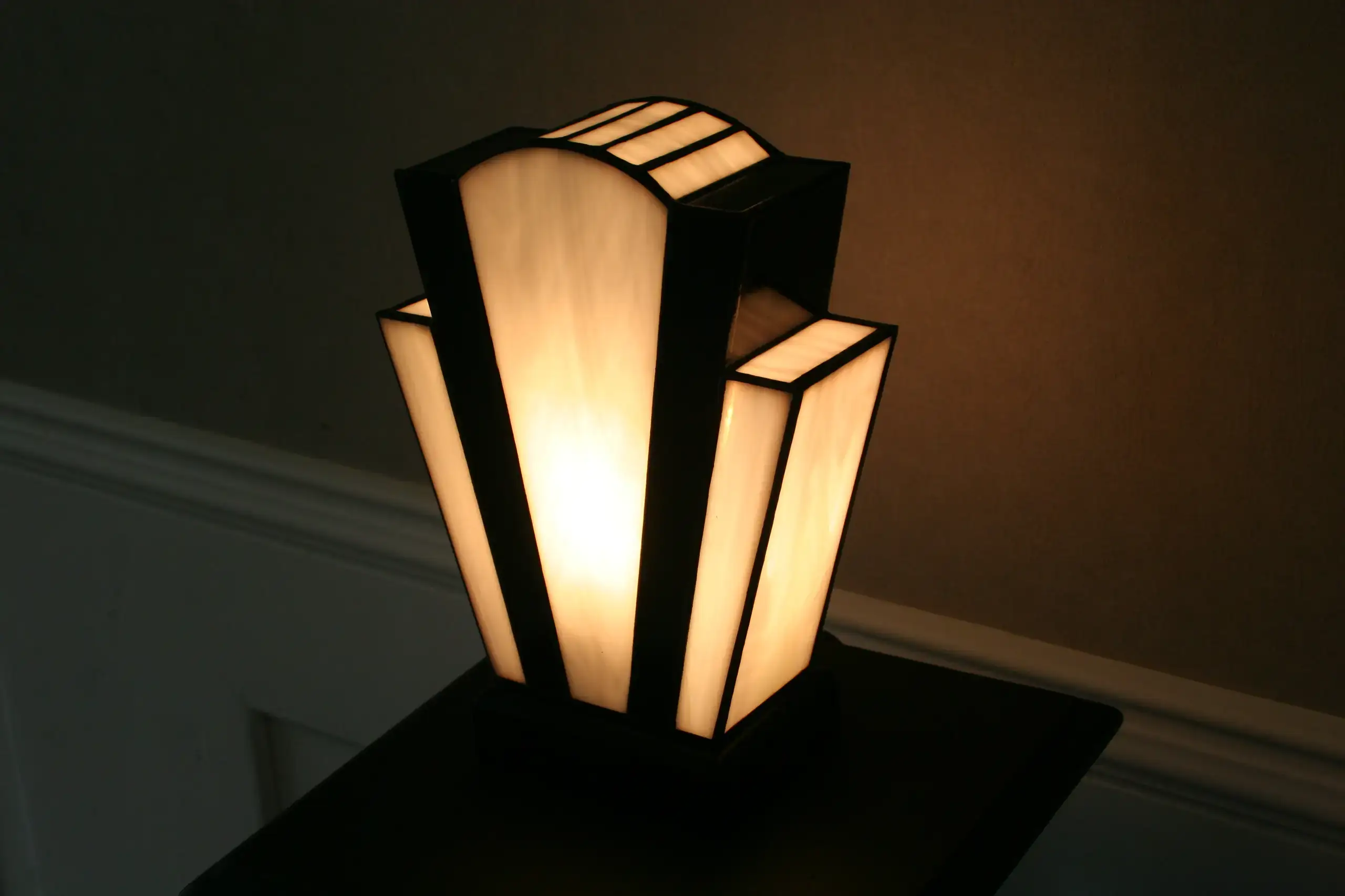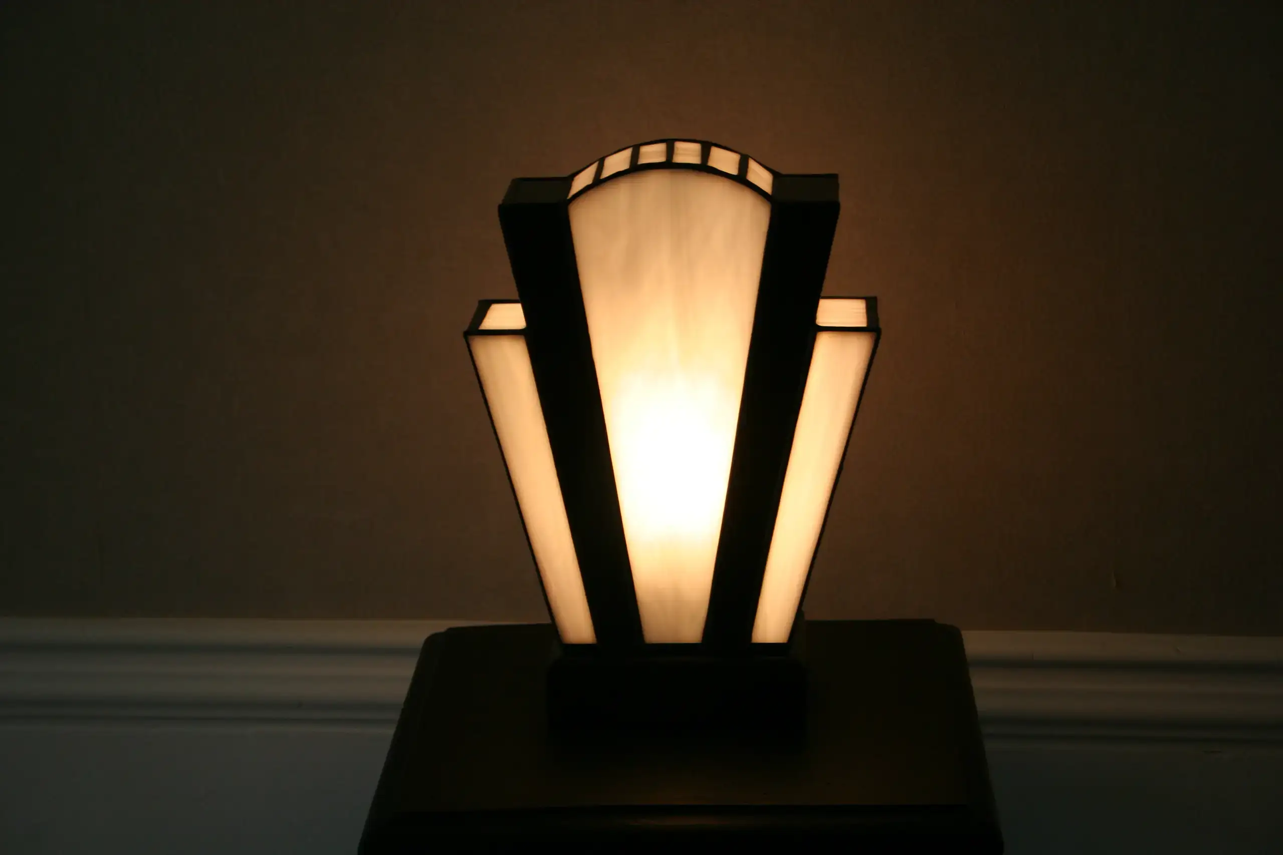 Lampe vitrail artisanale inspirée de l’esthétique Art Déco des années 1920. Sa composition géométrique associe des verres opalescents blanc perle lumineux à des lignes noires profondes qui structurent la silhouette et soulignent son architecture verticale.