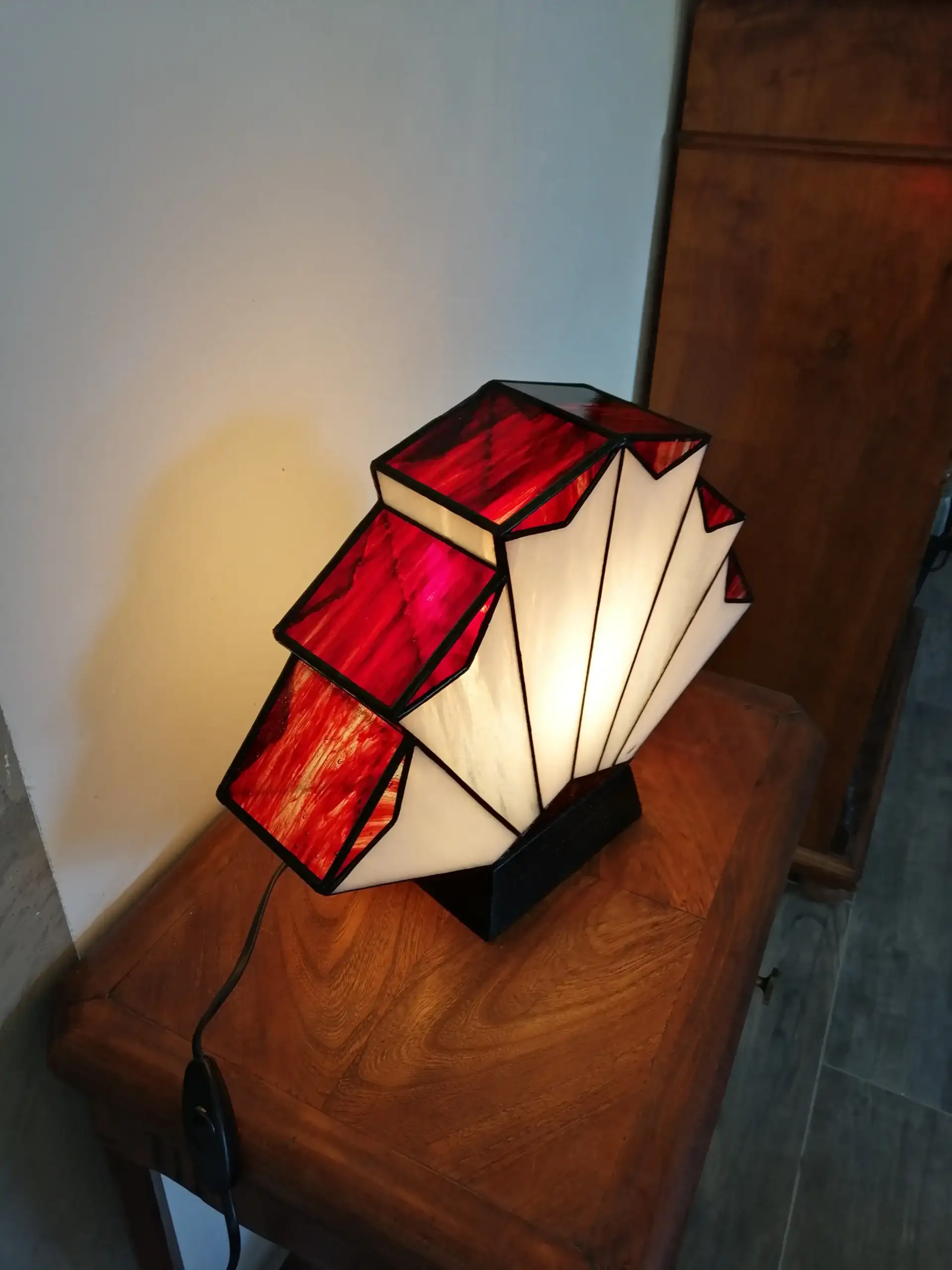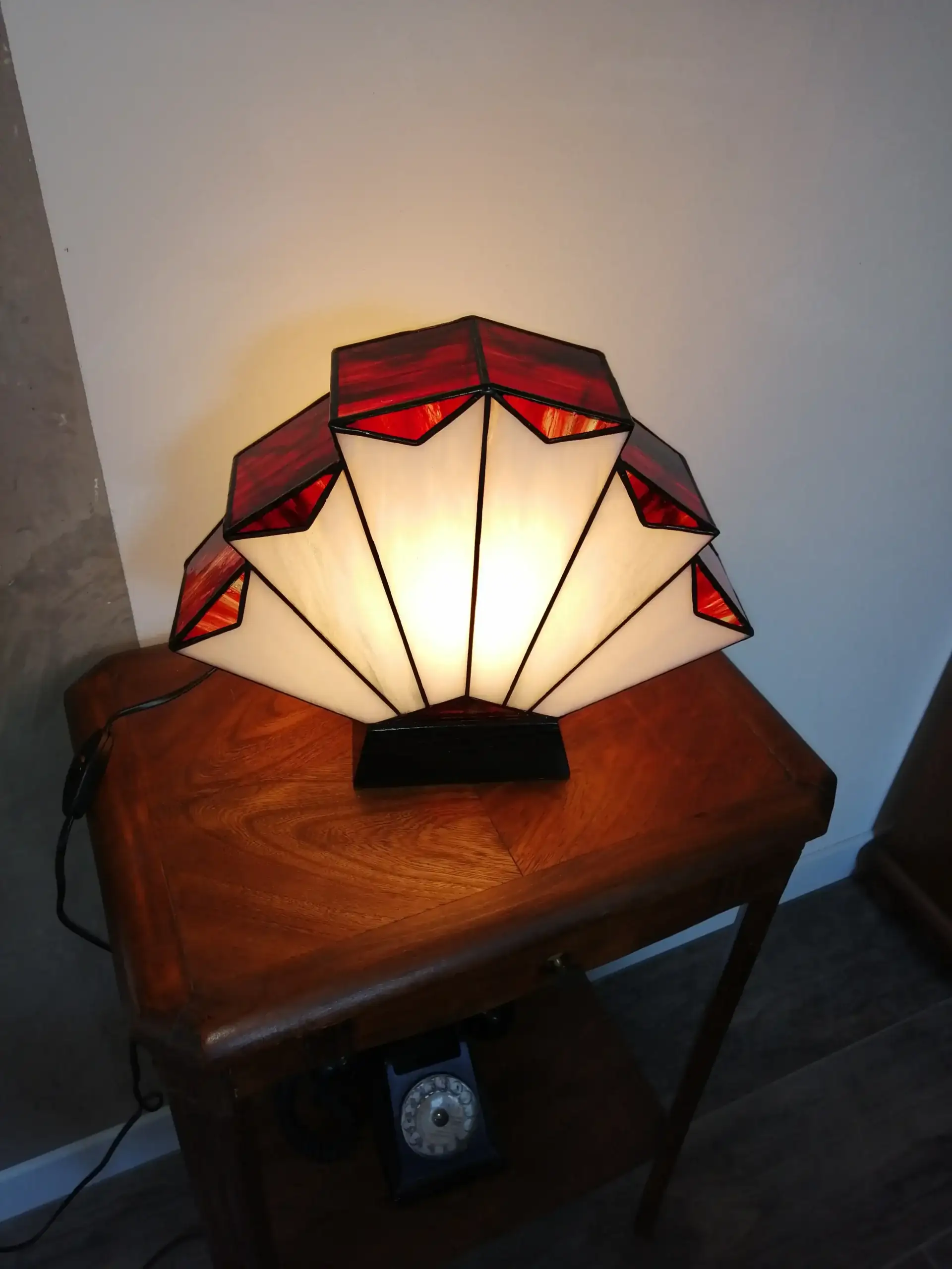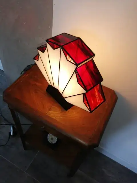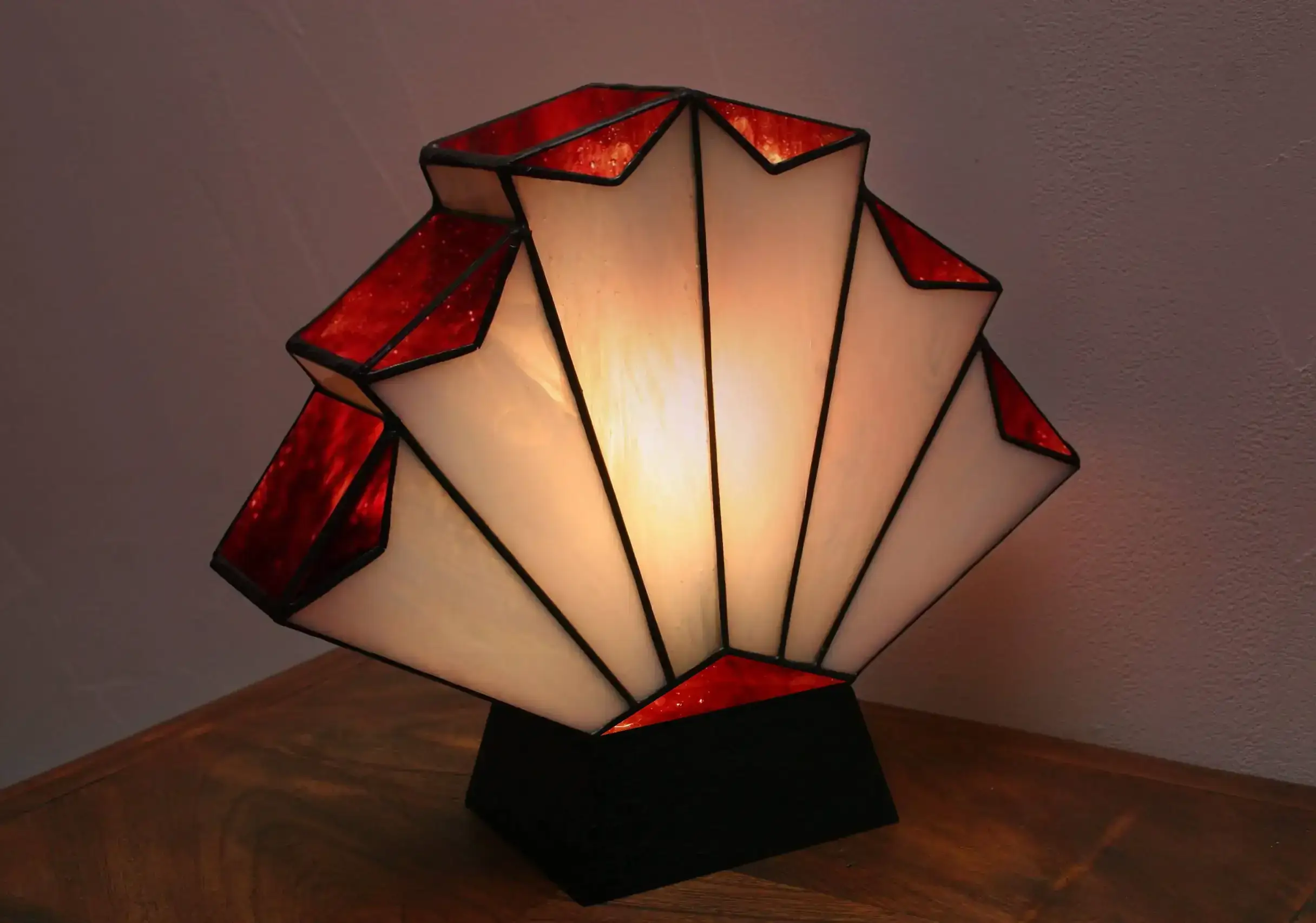 Lampe Art Déco « 1928 » en véritable vitrail Tiffany, réalisée à la main avec des verres opalescents blanc et rouge Andrinople. Sa forme en éventail diffuse une lumière douce et chaleureuse. Montée sur un socle en chêne massif patiné noir Napoléon, cette lampe artisanale associe élégance des années 1920 et savoir-faire verrier traditionnel.