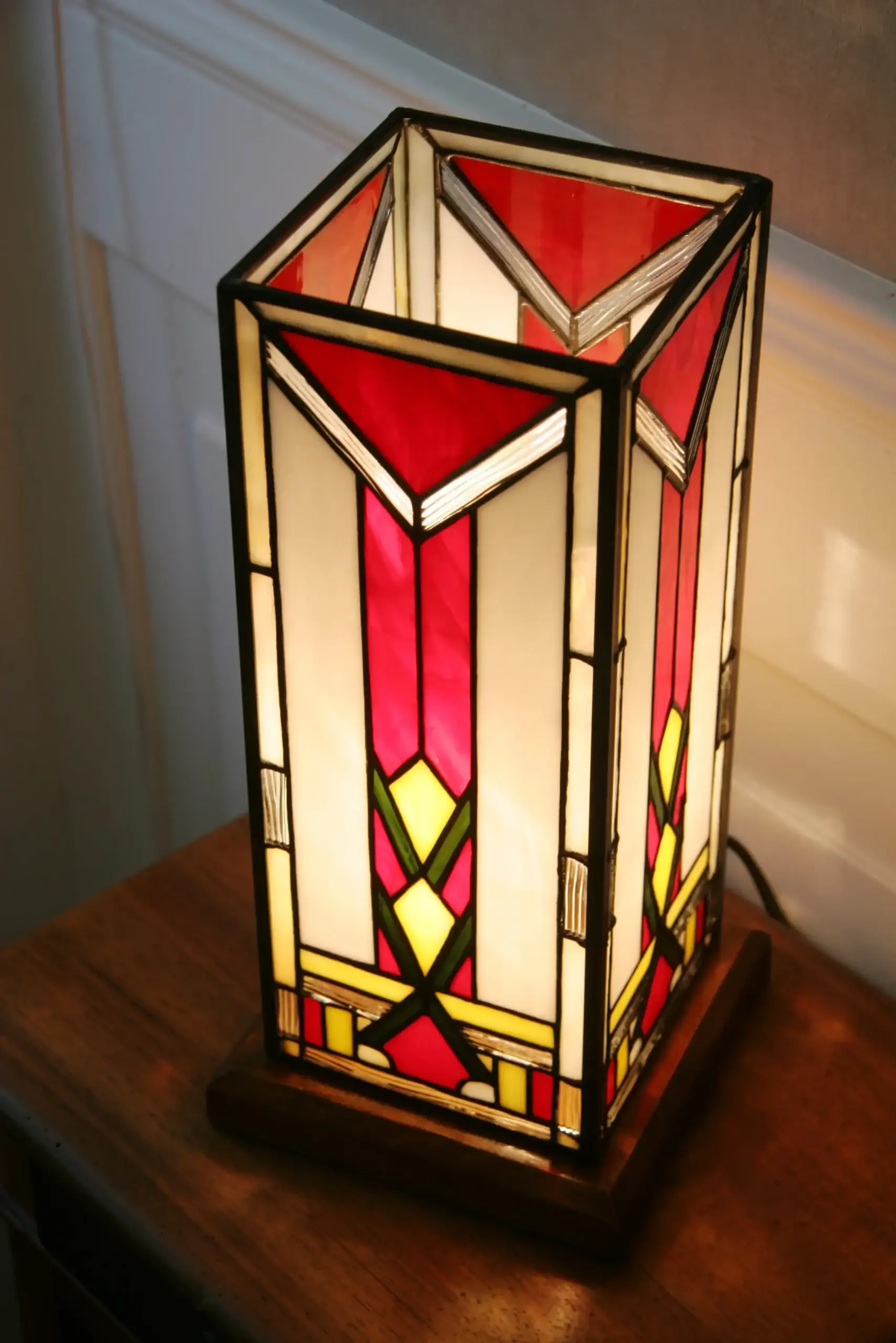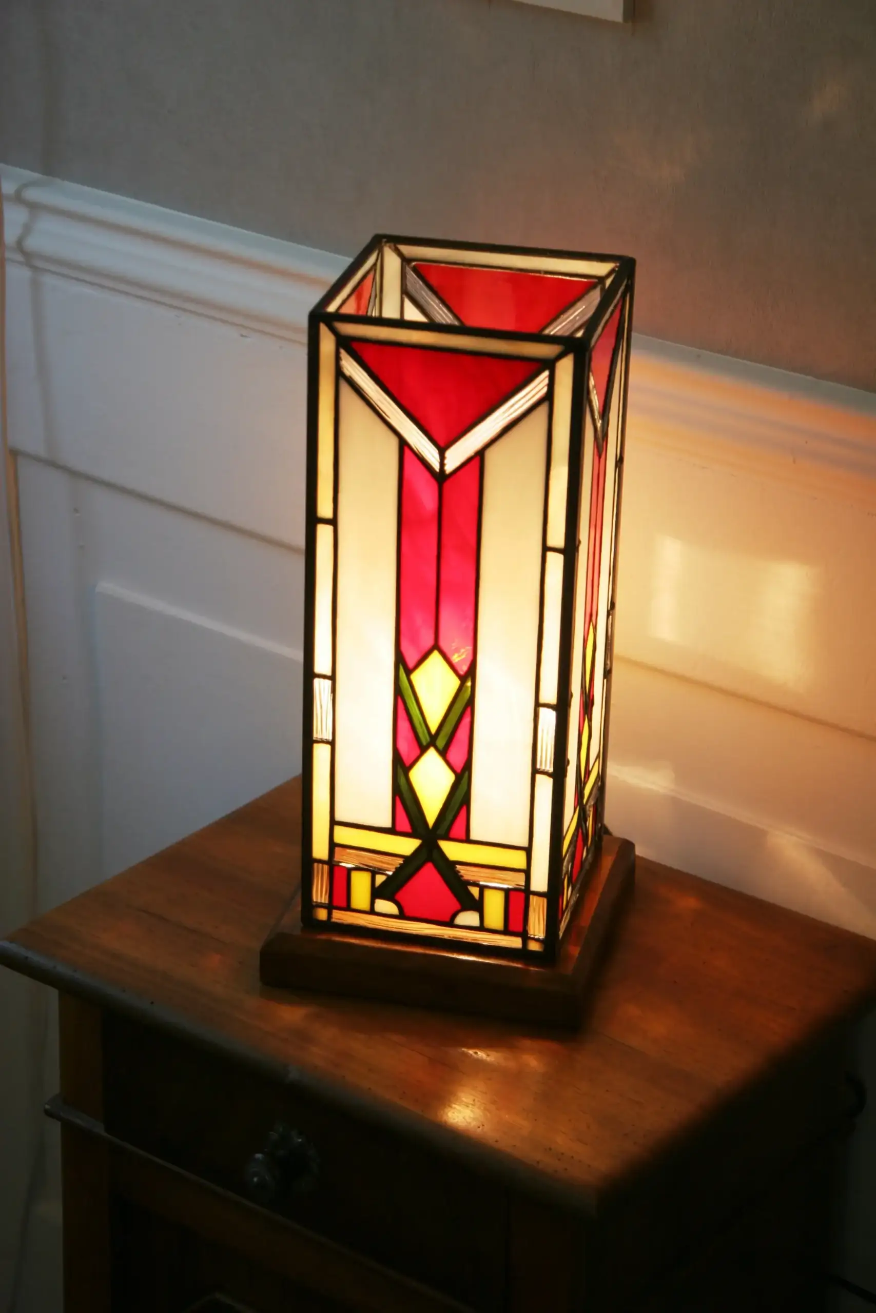 Lampe colonne en véritable vitrail Tiffany inspirée du style Art Déco, entièrement réalisée à la main dans mon atelier d’art verrier. La composition associe des verres opalescents blancs, rouges, verts et jaunes à des verres transparents striés qui captent et diffusent la lumière avec profondeur.