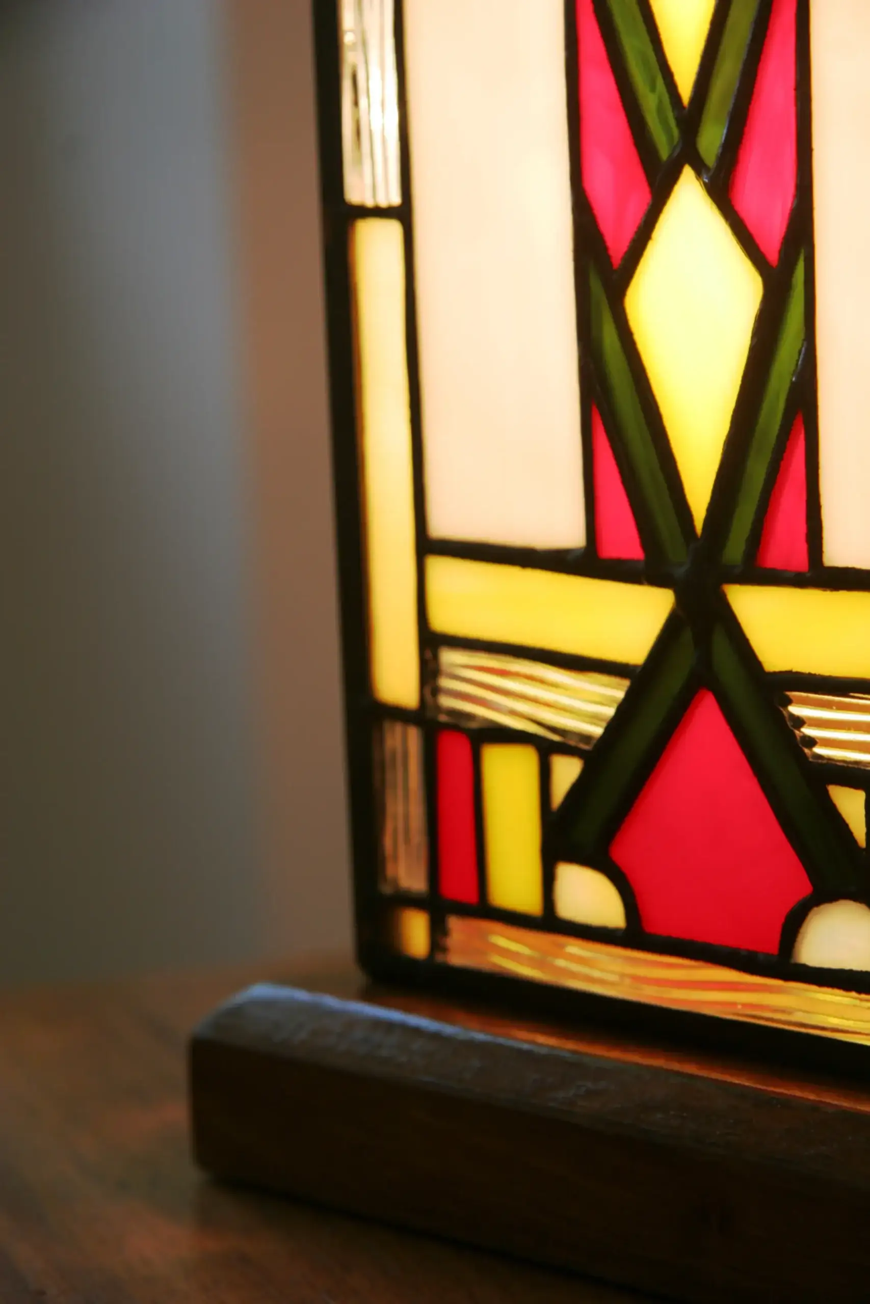 Je façonne chaque lampe comme une pièce de vitrail à part entière, dans la tradition des ateliers d’art verrier. Cette lampe colonne s’inspire des lignes élégantes du style Art Déco, où la géométrie devient rythme et lumière.