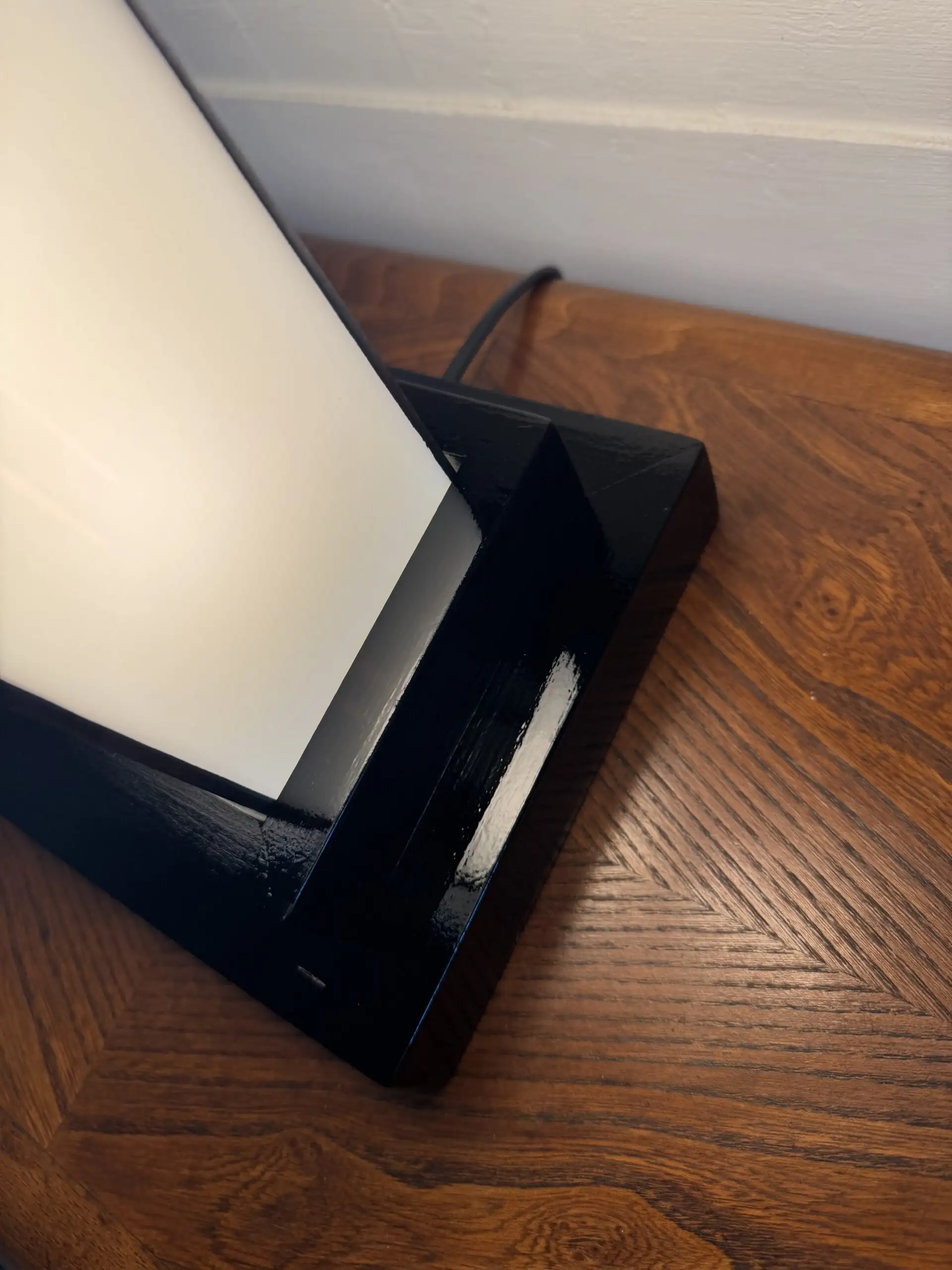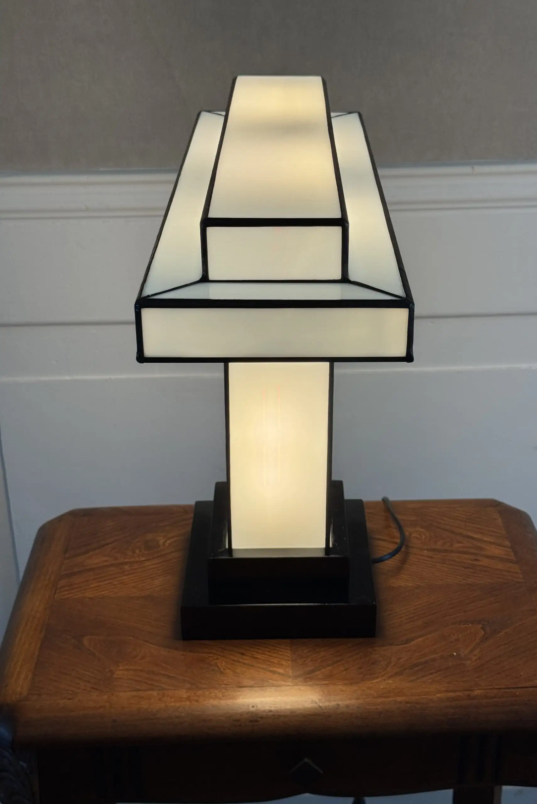 Réalisée en Vitrail Tiffany, sa conception repose sur une géométrie horizontale et une construction étagée, rappelant une structure architecturale d’immeuble Art Déco. La lampe est entièrement construite autour du contraste puissant et intemporel du Blanc Opalescent et du Noir Opaque.