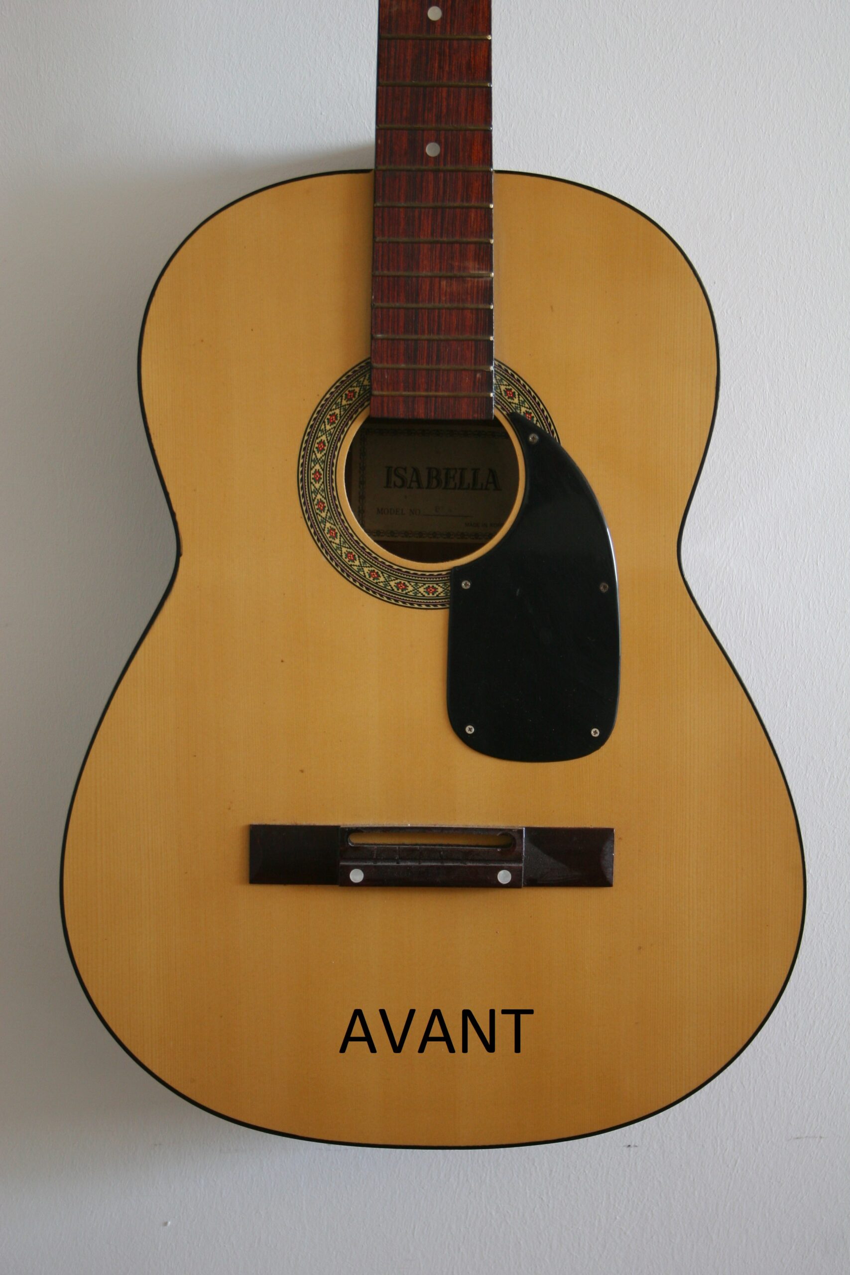 Une guitare d’apprentissage transformée en pièce décorative unique, où la musique dialogue avec la lumière.