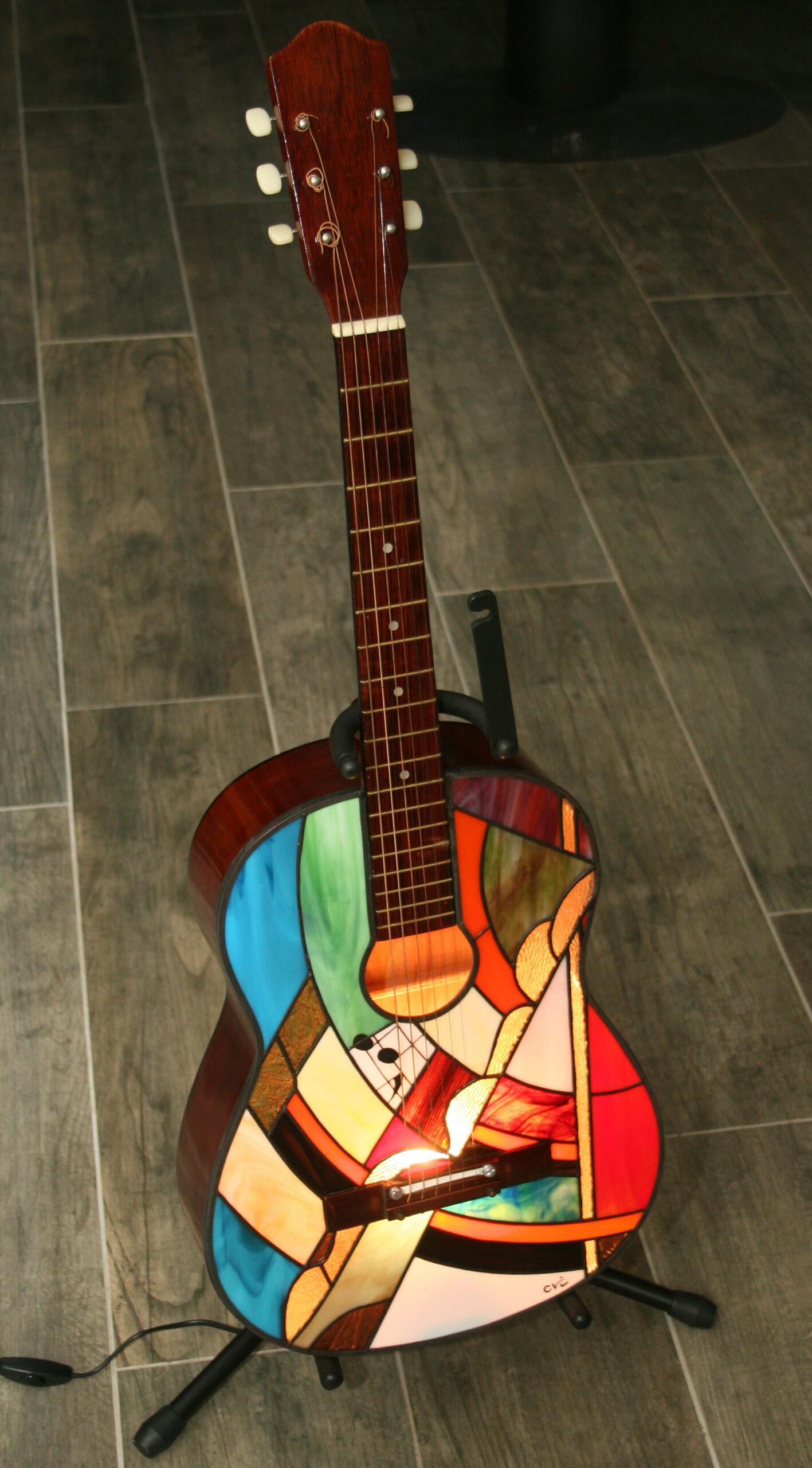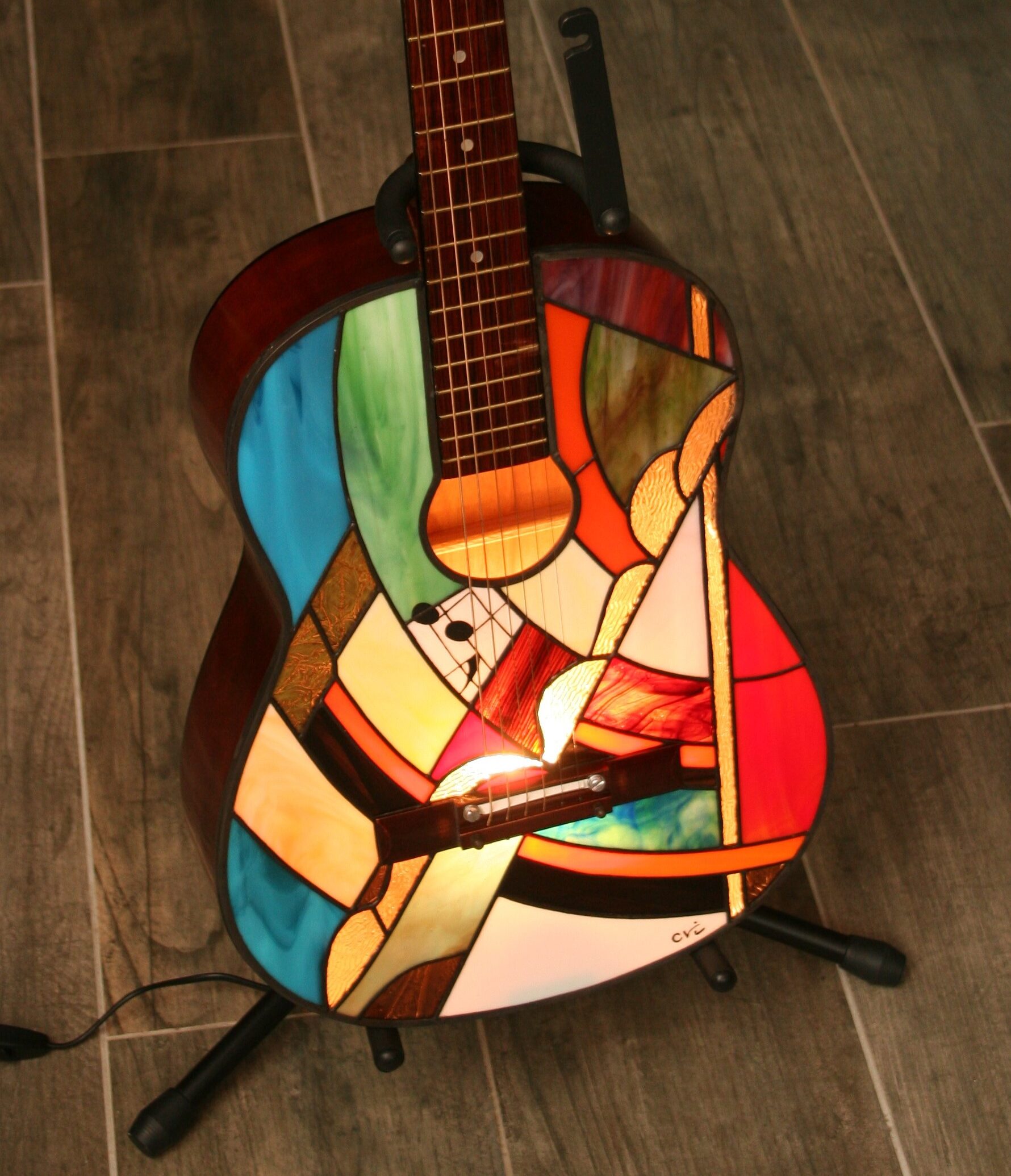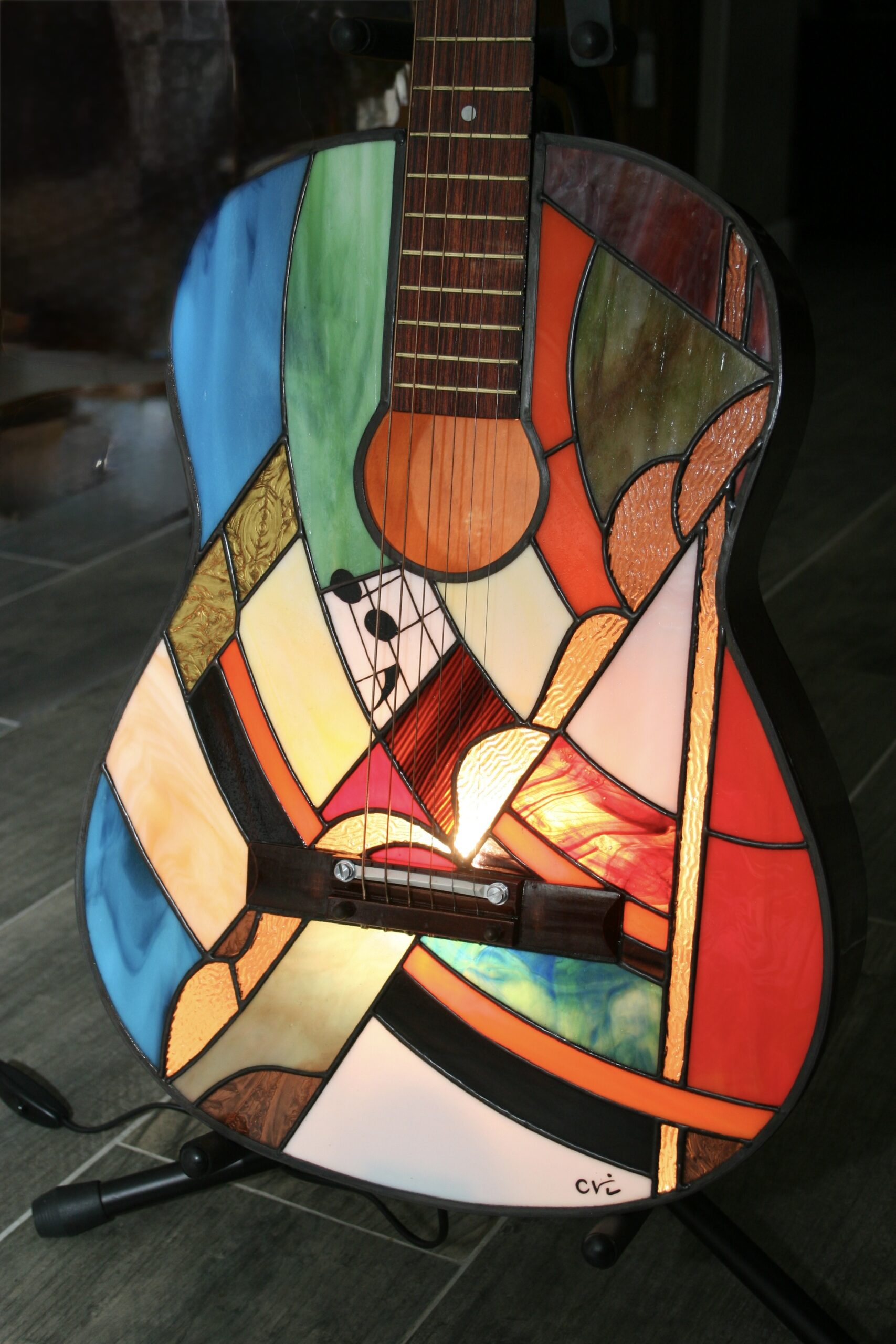 Une guitare artisanale métamorphosée en vitrail