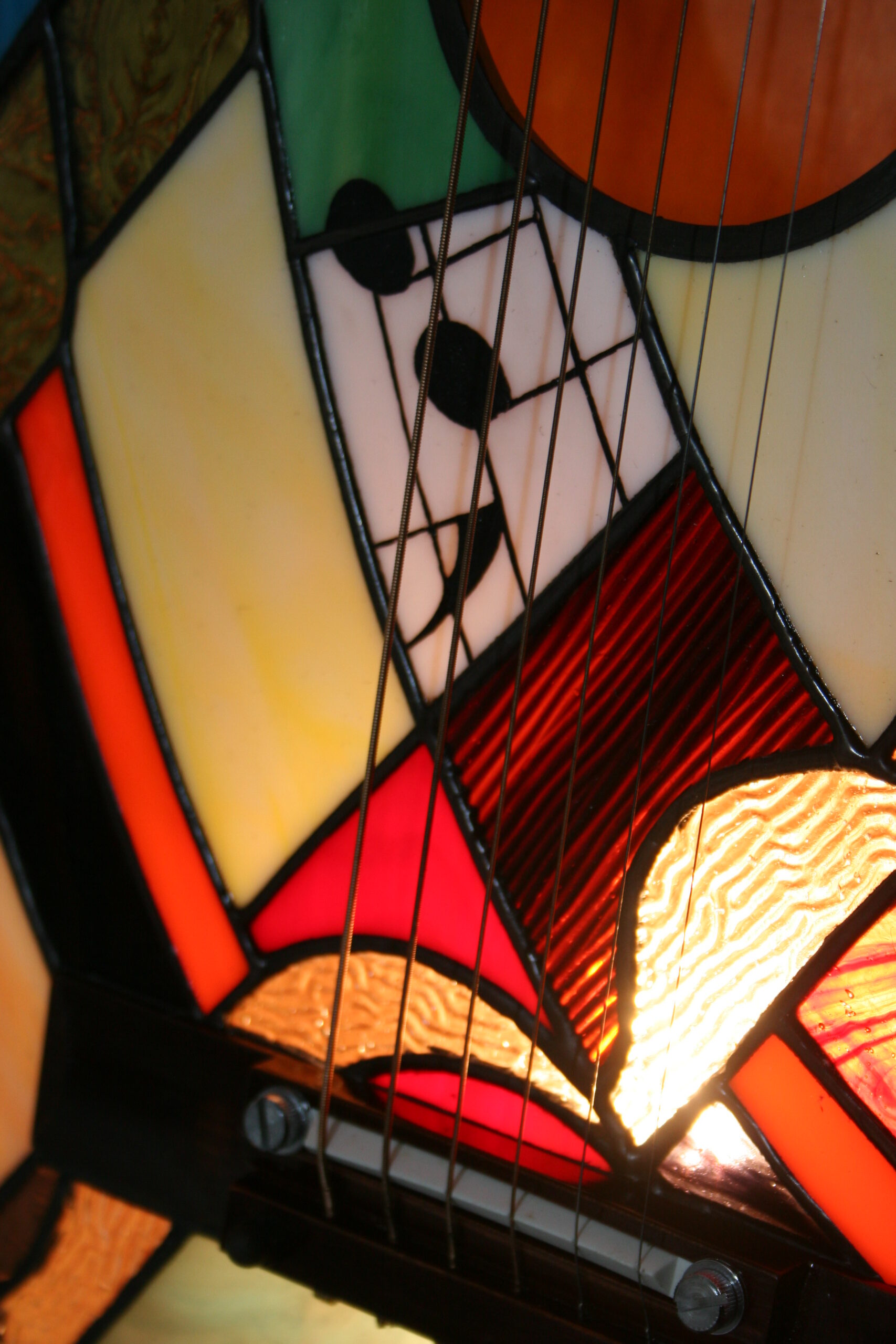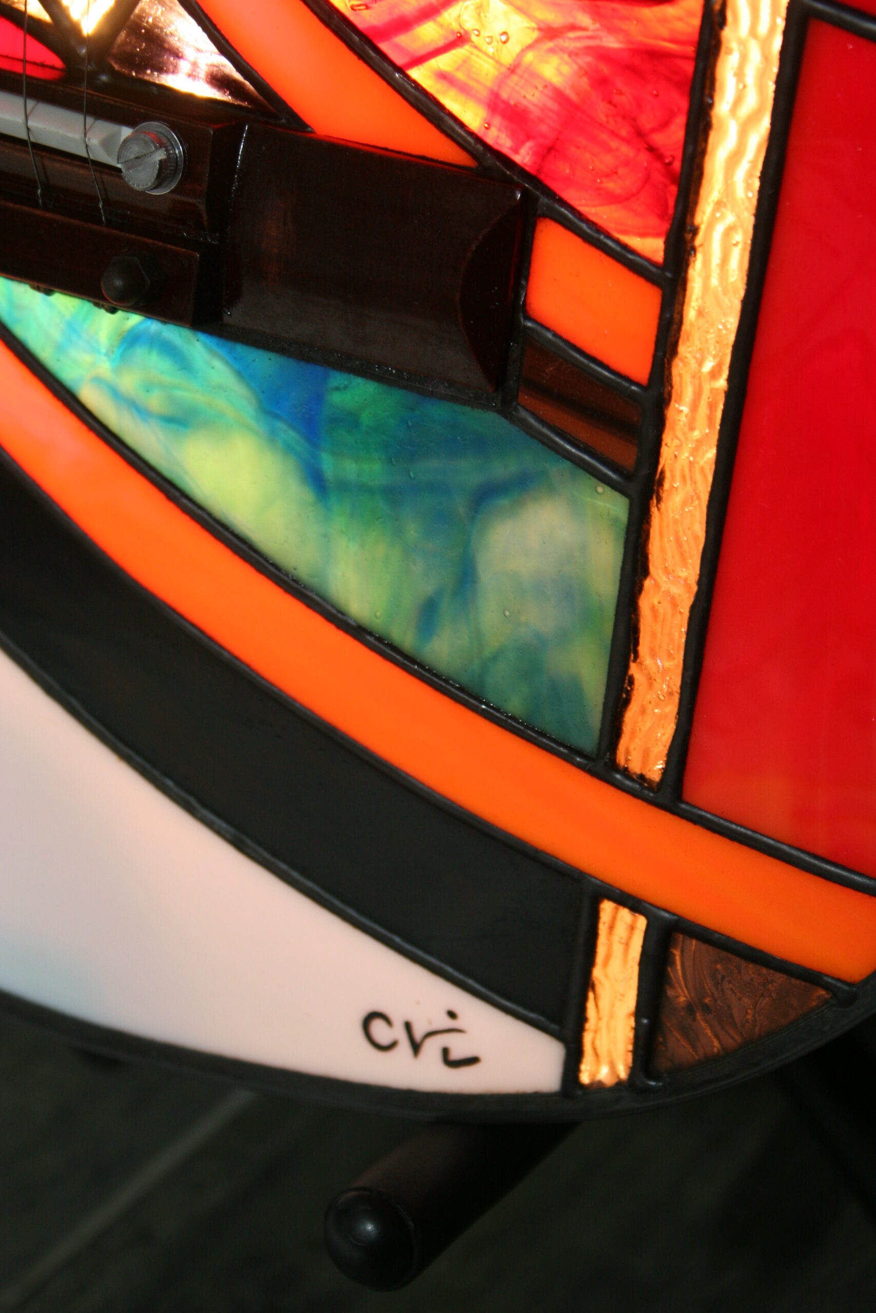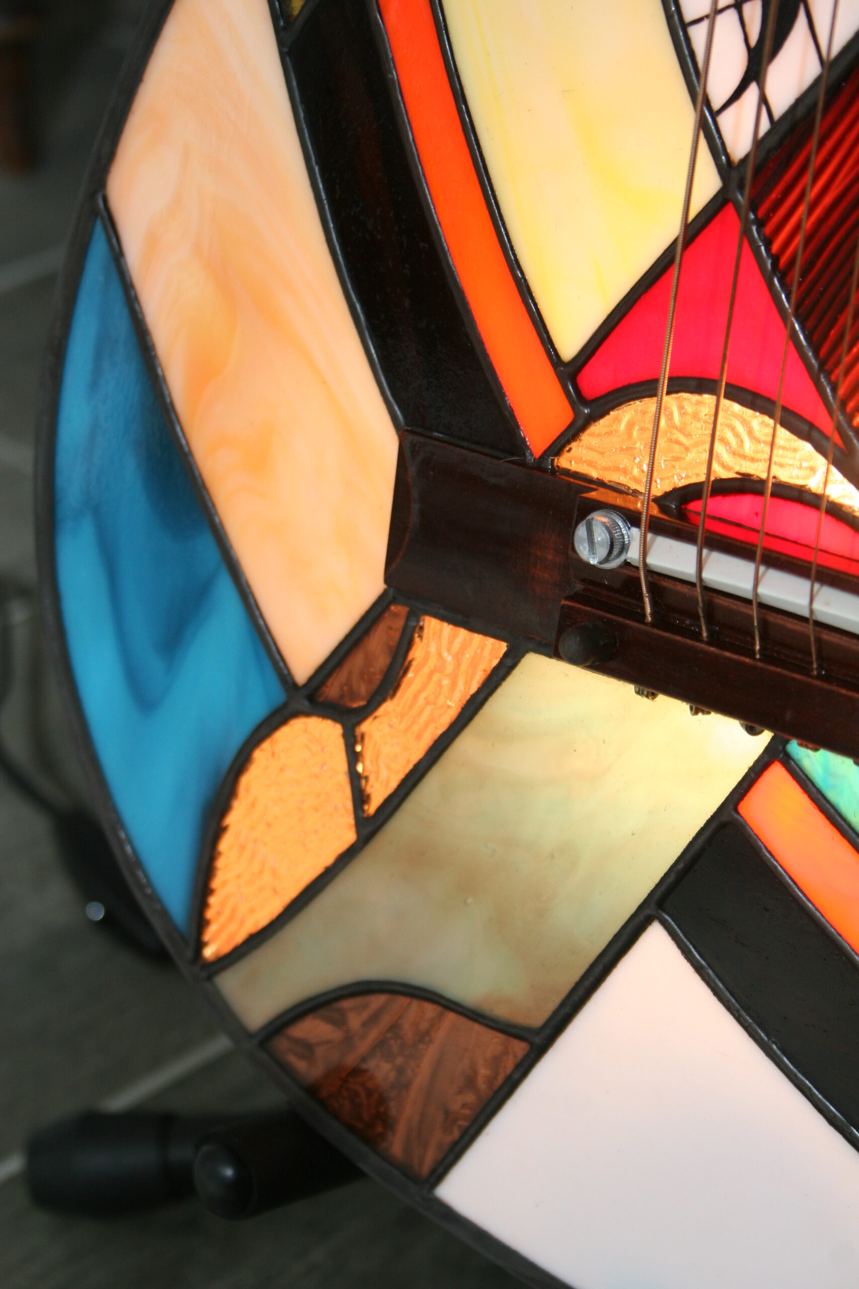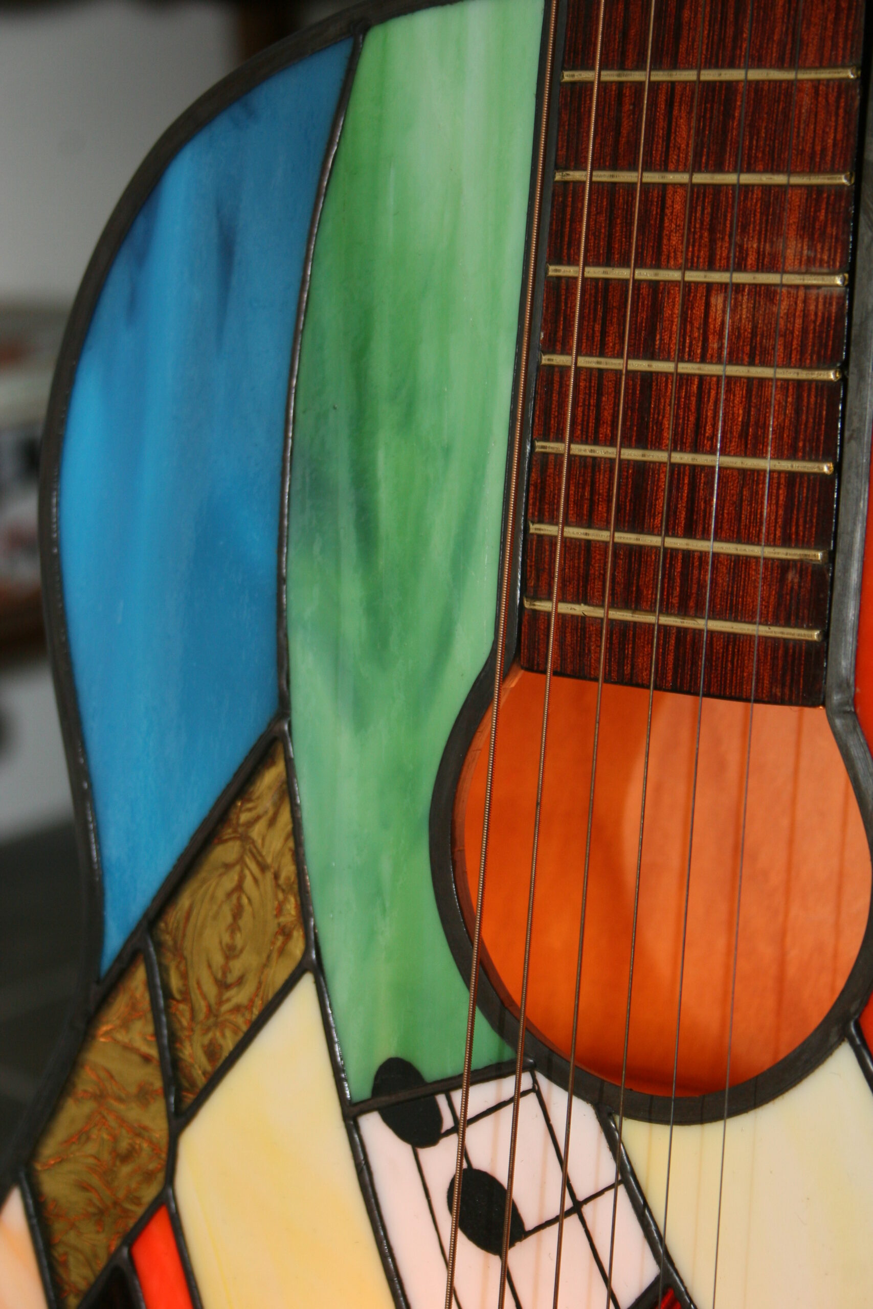 Chaque guitare est une pièce unique, réalisée dans le respect des techniques traditionnelles du vitrail Tiffany, et s’inscrit dans mon univers de luminaires et sculptures en verre.