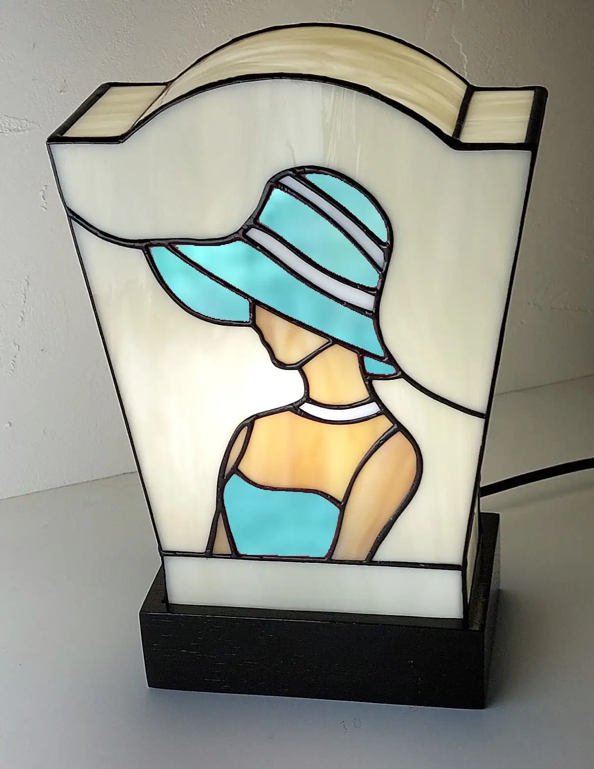 Le verre est principalement d’un ivoire opalescent, offrant une lumière tamisée et chaleureuse. Le portrait se distingue par l’utilisation audacieuse d’un bleu azur éclatant pour la robe et le grand chapeau à rayures, contrastant avec le verre ambre et cuivré utilisé pour la peau.