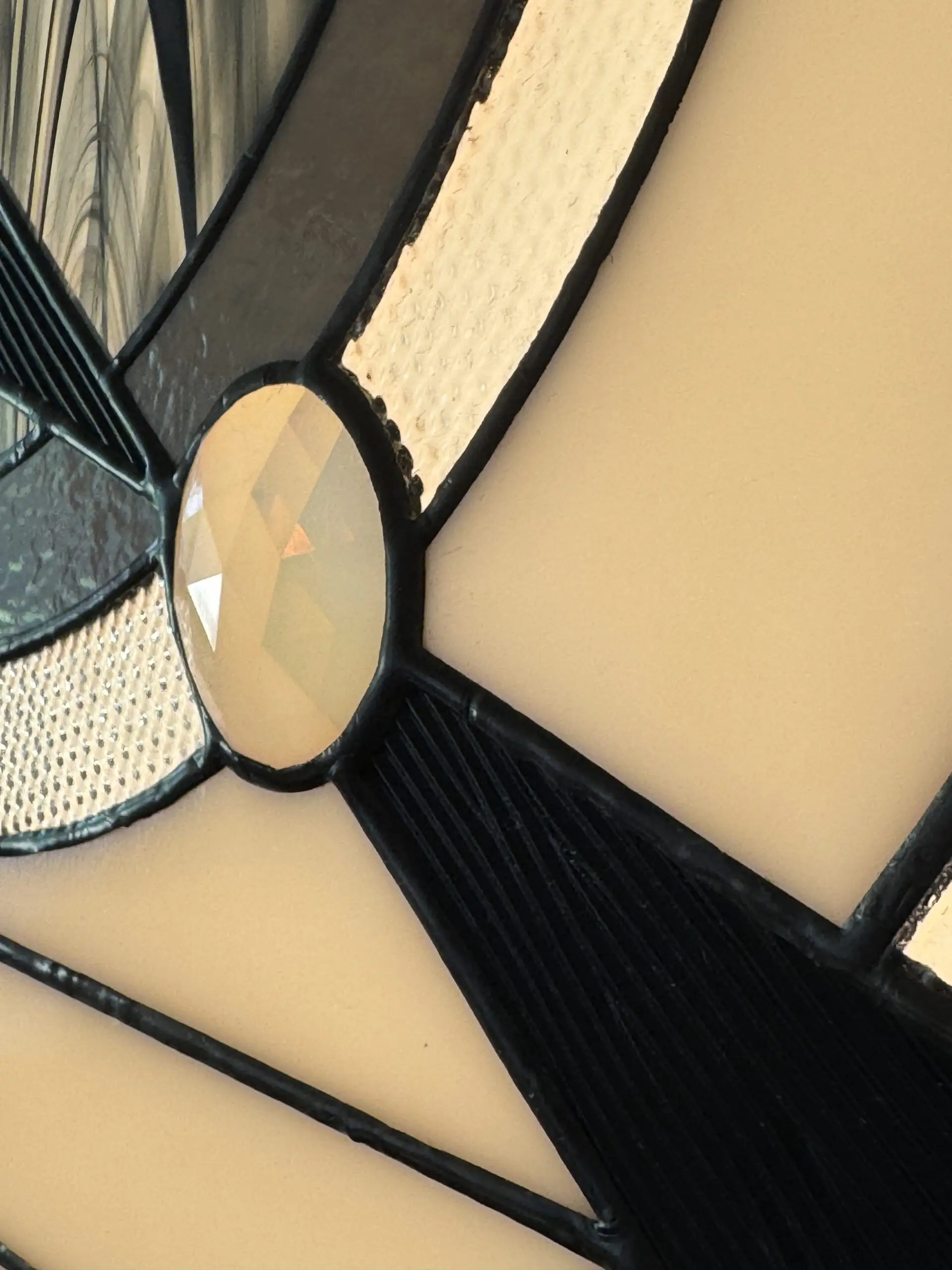 Edora » N°961 est une œuvre lumineuse en vitrail Tiffany, inspirée de l’Art Déco, qui allie élégance artistique et fonctionnalité. Réalisée avec des verres opalescents soigneusement sélectionnés et rehaussée de cabochons en relief et d’éléments métalliques, elle offre un rendu spectaculaire, allumée comme éteinte.