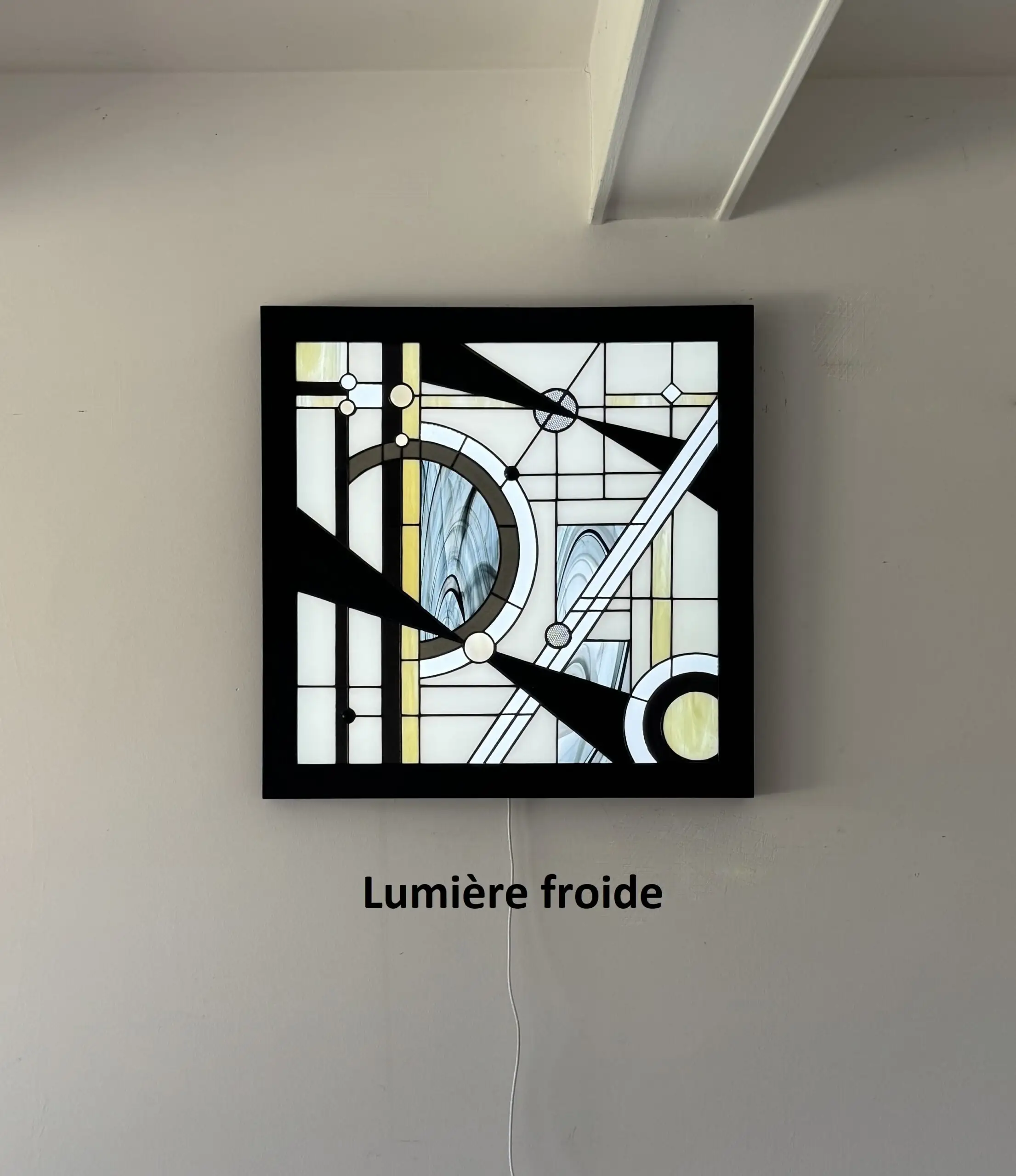 Dans mon atelier d’artiste-verrier, j’ai conçu Edora N°961 comme une véritable œuvre murale lumineuse, à la frontière entre le tableau décoratif et le luminaire architectural. Réalisée en vitrail Tiffany et équipée de LEDs intégrées, cette création transforme le mur en source de lumière douce et enveloppante.