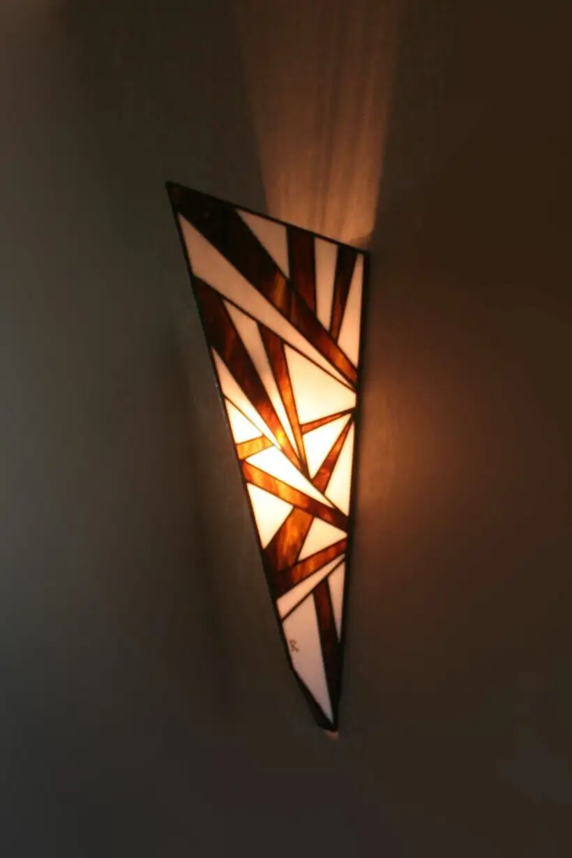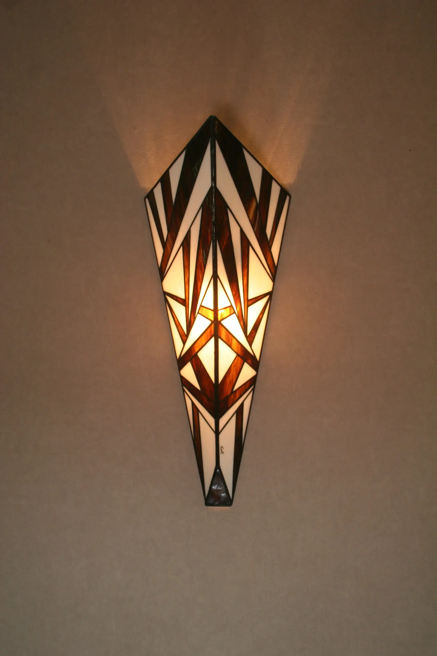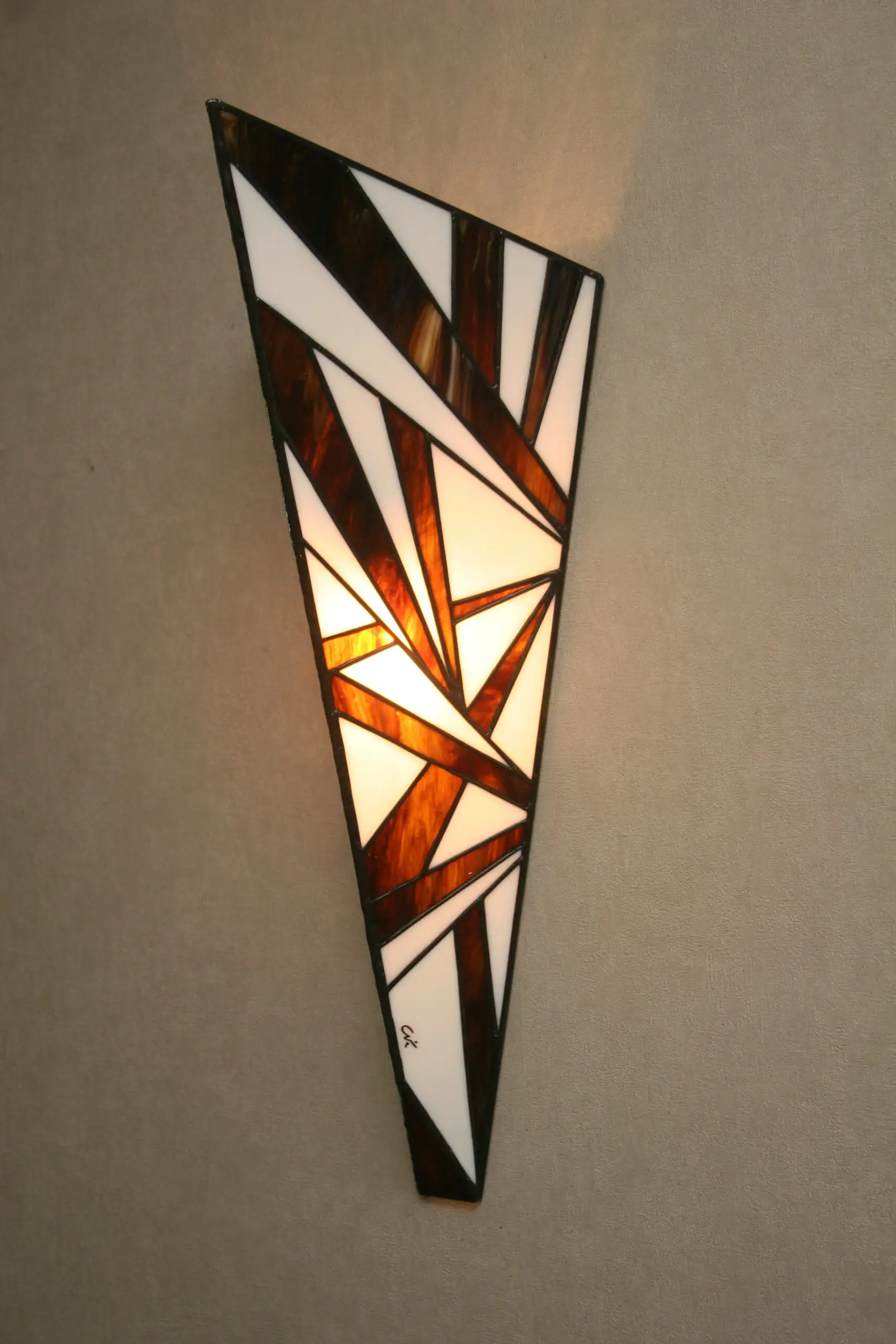 Réalisée dans le plus pur esprit Art Déco, cette applique associe des verres Blanc Ivoire Opale à des verres Brun Chocolat Fumé / Ambré. Les découpes géométriques du vitrail créent un jeu de contrastes chaleureux et diffusent un éclairage à la fois doux et lumineux, idéal pour une ambiance raffinée et singulière.