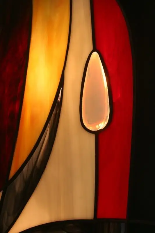 La composition associe des verres opalescents très lumineux aux nuances riches et contrastées : rouges profonds et rouges vifs, ivoire, jaune mimosa, gris perle, violets foncés, noirs, orange, bleu outremer, turquoise et vert vif.